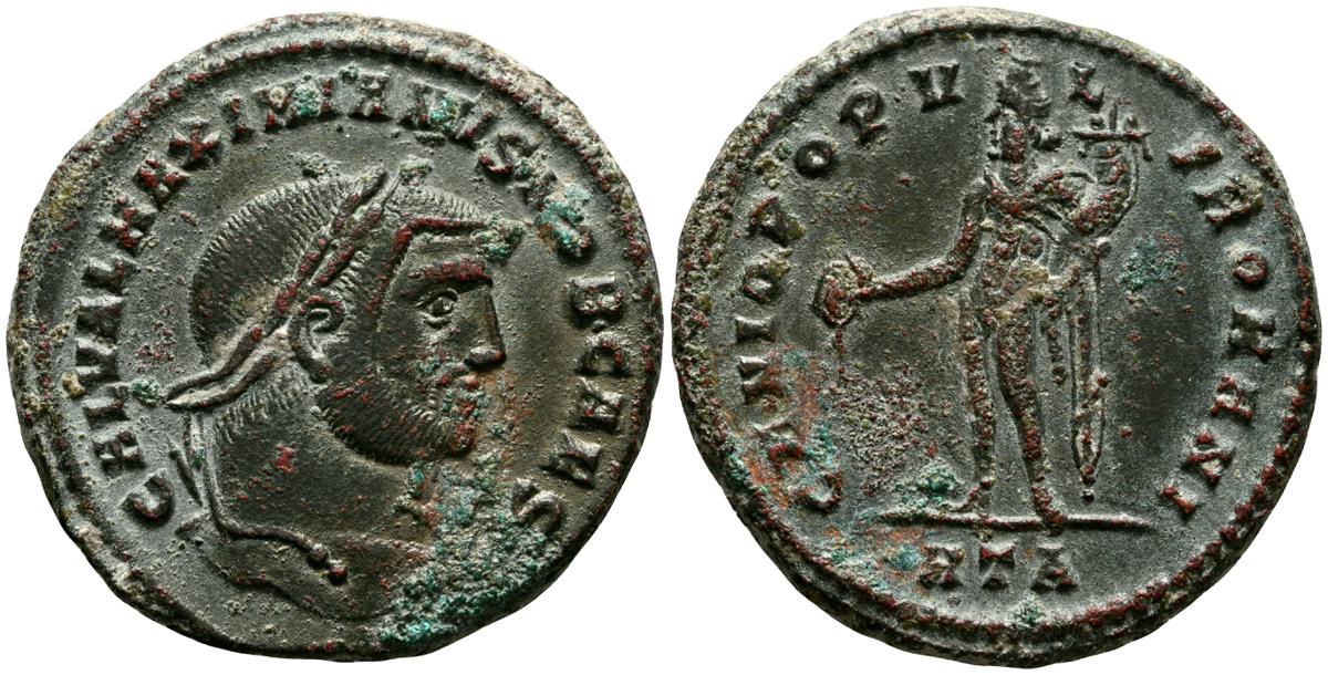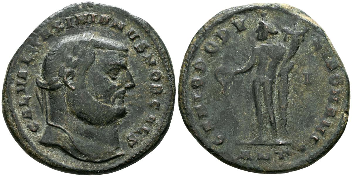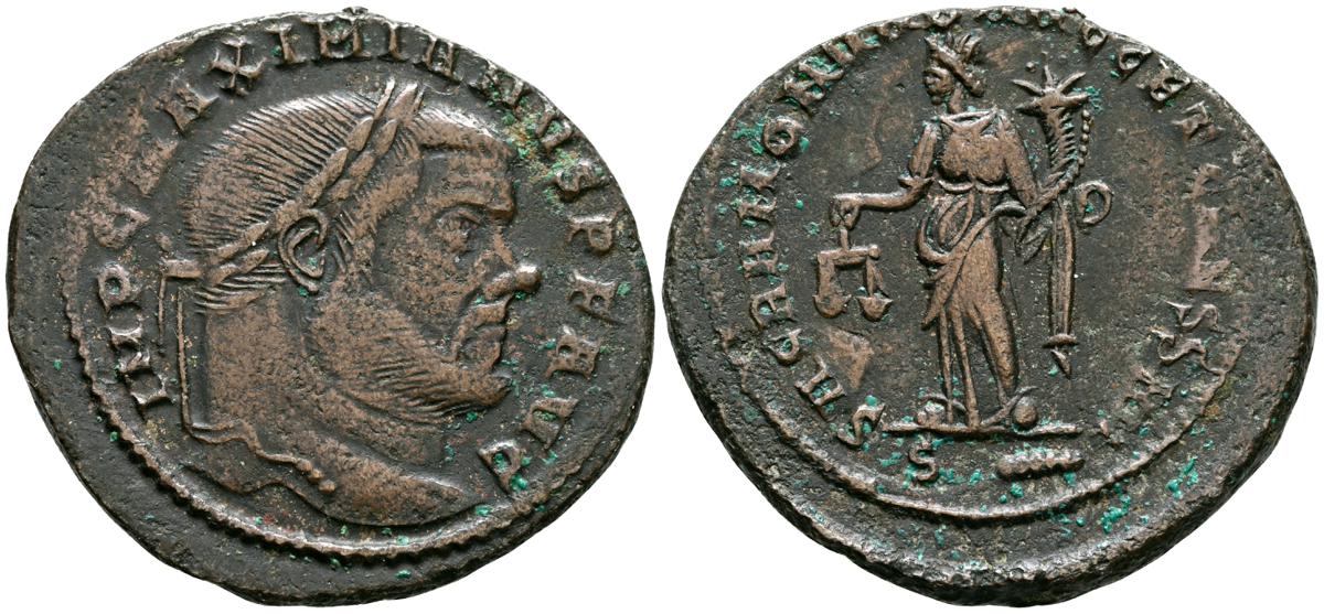 MAXIMIANO HERCULEO. Follis. (Ae. 9,69g/30mm). 300-301 d.C. Roma. (RIC 100b). Anv: Busto laureado de Maximiano Herculéo a derecha, alrededor leyenda: IMP C MAXIMIANVS P F AVG. Rev: Moneta estante a izquierda portando escalas y cornucopia, en exergo: S-mazo, alrededor leyenda: SACRA MON VRB AVGG ET CAESS N N. MBC.