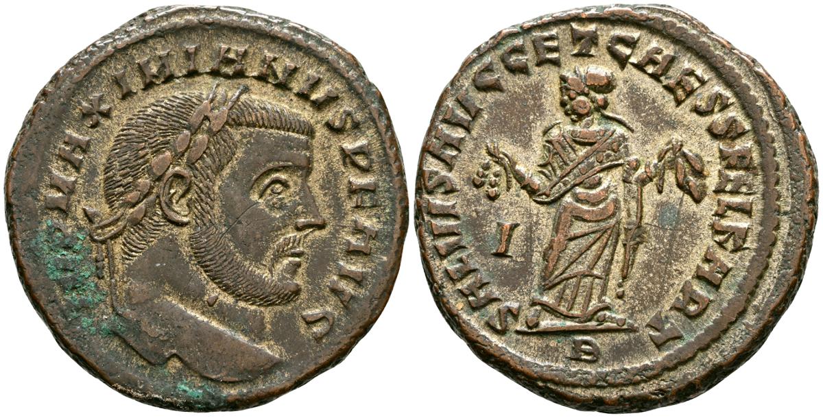 MAXIMIANO. Follis. (Ae. 10,50g/27mm). 299-303 d.C. Cártago. (RIC 31b). Anv: Cabeza laureada de Maximiano a derecha, alrededor leyenda: IMP MAXIMIANVS P F AVG. Rev: Cártago estante a izquierda portando frutas en ambas manos, en campo: I, en exergo: B, alrededor leyenda: SALVIS AVGG ET CAESS FEL KART. MBC+.