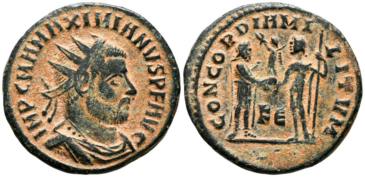 MAXIMIANO. Antoniniano. (Ae. 3,29g/21mm). 293-294 d.C. Cícico. (RIC 19). Anv: Busto radiado y drapeado con coraza de Maximiano a derecha, alrededor leyenda: IMP C M A MAXIMIANVS PROG. Rev: Maximiano estante a derecha recibiendo Victoria con corona de laurel de Júpiter estante a izquierda por lanza, entre ellos KB, alrededor leyenda: CONCORDIA MILITVM. MBC+.