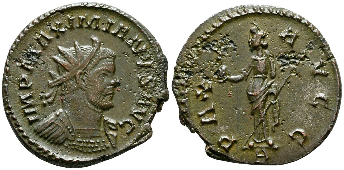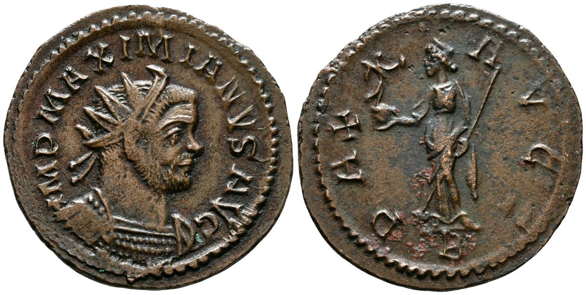 MAXIMIANO. Antoniniano. (Ae. 4,22g/22mm). 290-291 d.C. Lugdunum. (RIC 399). Anv: Busto radiado y con coraza de Maximiano a derecha, alrededor leyenda: IMP MAXIMIANVS AVG. Rev: Pax estante a izquierda portando cetro y victoria sobre globo, en exergo: A, alrededor leyenda: PAX AVGG. EBC-/MBC+. Escaso ejemplar.