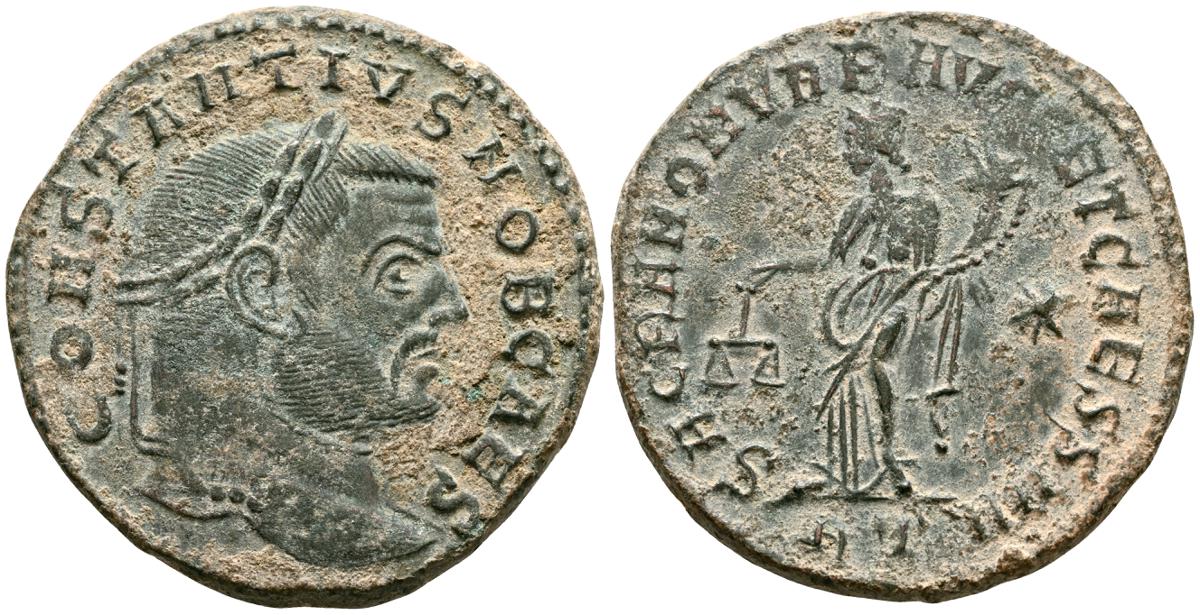 CONSTANCIO I. Follis. (Ae. 8,69g/28mm). 302-303 d.C. Roma. (RIC 10a). Anv: Cabeza laureada de Constancio I a derecha, alrededor leyenda: CONSTANTIVS NOB CAES. Rev: Moneta estante a izquierda portando escala y cornucopia, en campo: estrella, en exergo: RT, alrededor leyenda: SACRA MON VRB AVGG ET CAESS NN. MBC.