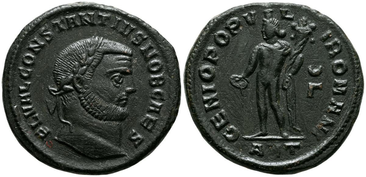 CONSTANCIO I. Follis. (Ae. 8,95g/27mm). 299-300 d.C. Antioquía. (RIC 55a). Anv: Cabeza laureada de Constancio I a la derecha, alrededor leyenda: FL VAL CONSTANTIVS NOB CAES. Rev: Genio estante a izquierda portando patera y cornucopia, en campo: creciente/r, en exergo: ANT, alrededor leyenda: GENIO POPVLI ROMANI. MBC+.