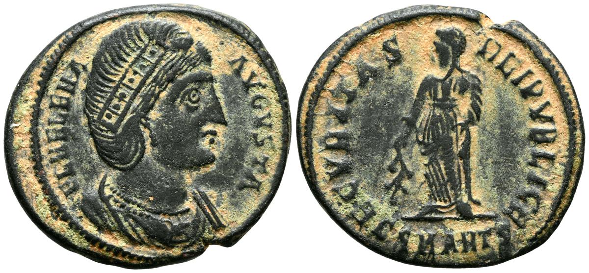 ELENA. Follis. (Ae. 2,79g/19mm). 326-328 d.C. Antioquía. (RIC 159). Anv: Busto diademado y drapeado de Elena a derecha, alrededor leyenda: FL HELENA AVGVSTA. Rev: Securitas estante a izquierda portando rama de olivo, en exergo: SMANTZ, alrededor leyenda: SECVRITAS REI PVBLICA. MBC+.