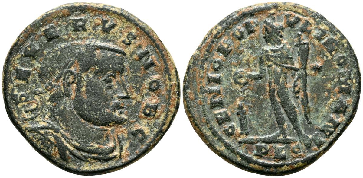 GALERIO. Follis. (Ae. 10,41g/27mm). 303-305 d.C. Lugdunum. (RIC 180b). Anv: Busto laureado y con coraza de Galerio a izquierda, alrededor leyenda: MAXIMIANVS NOB C. Rev: Genio estante a izquierda portando patera sobre altar y cornucopia, en campo: estrella, en exergo: PLC, alrededor leyenda: GENIO POPVLI ROMANI. MBC+.