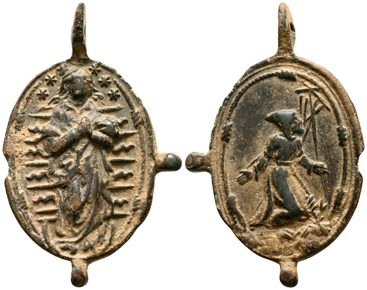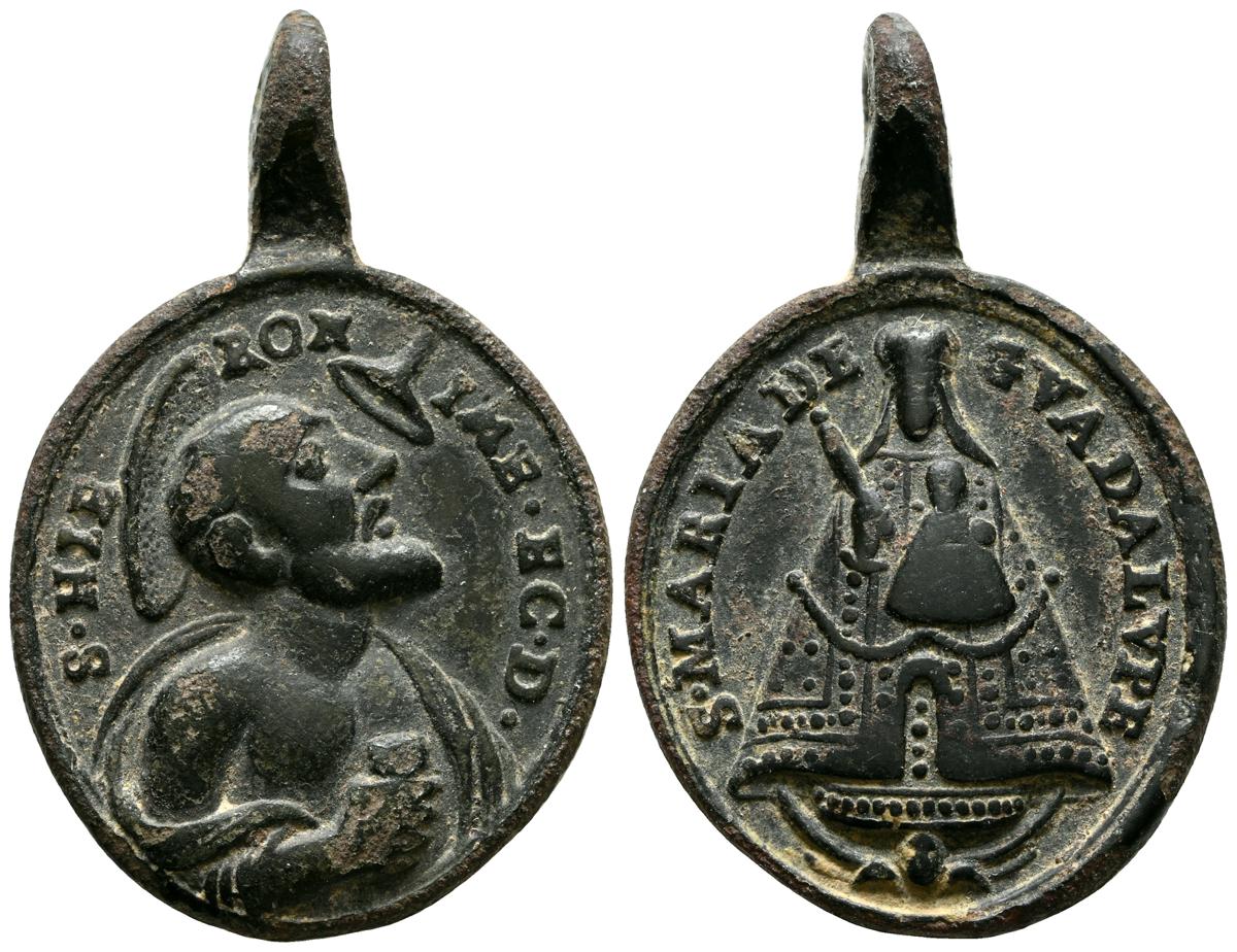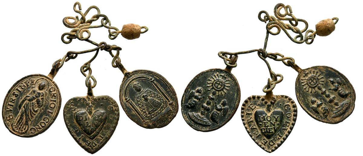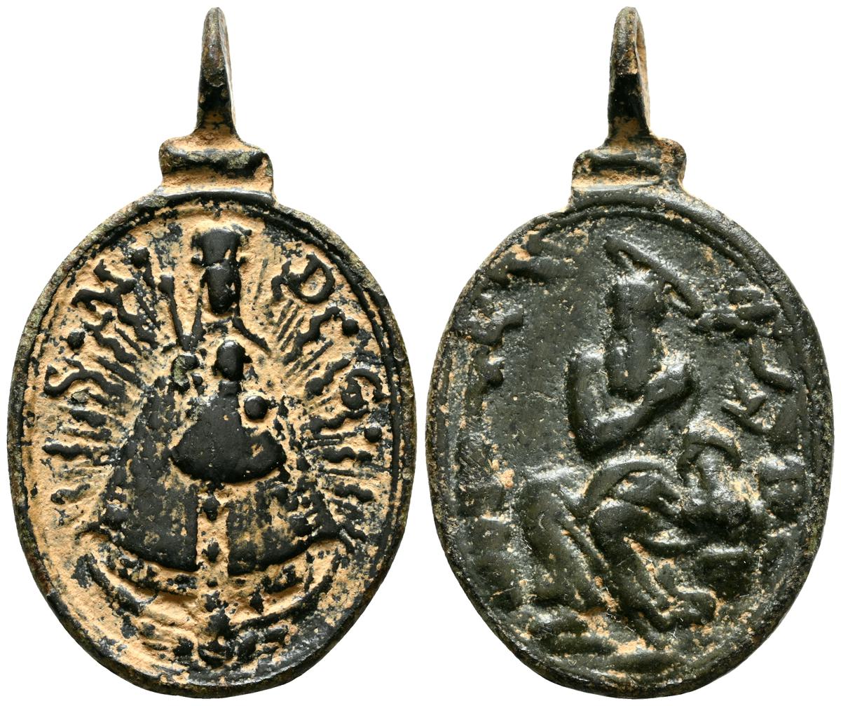Interesantísimo conjunto de medallas devocionales, compuesto por 23 preciosas piezas, realizas entre el siglo XVII y XIX. A destacar un gran variedad de abvocaciones y santos como; Ntrs. Sr. de Atocha; Ntrs. Sr. de Monserrat; Mater Dolorosa, Inmaculada Concepción; Santa Barbara, Corazón de Jesús y María, S. Miguel Arcángel, S. Juan Evangelista y S. Antonio en otros. Diferentes variantes, medidas y estados de conservación. A EXAMINAR