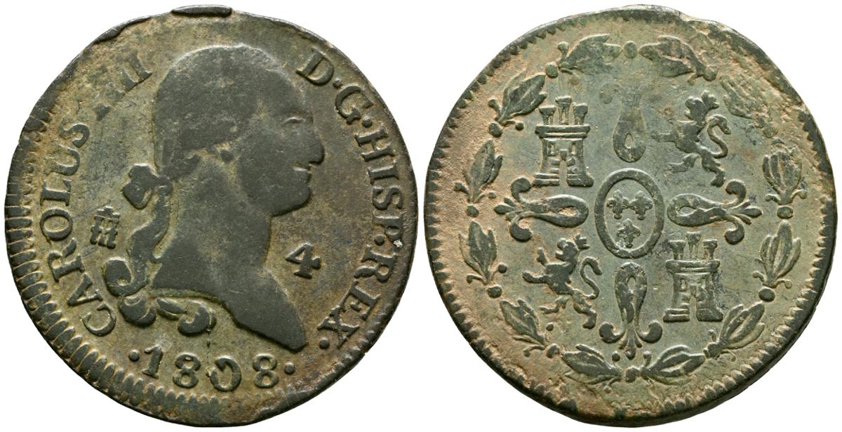 CARLOS IV (1788-1808). 4 Maravedís. (Ae. 4,89g/26mm). 1808. Segovia. (Cal-2019-62). BC+. Escasa.