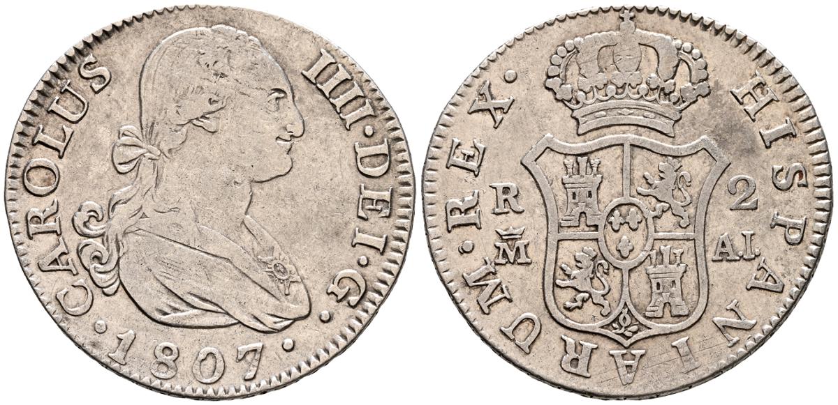 CARLOS IV (1788-1808). 2 Reales. (Ar. 5,84g/26mm). 1807. Madrid FA. (Cal-2019-616). MBC/MBC+. Ligeros restos de brillo original.