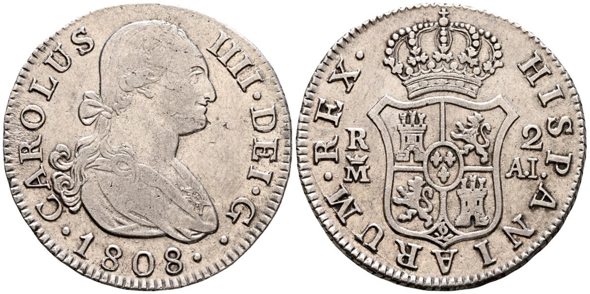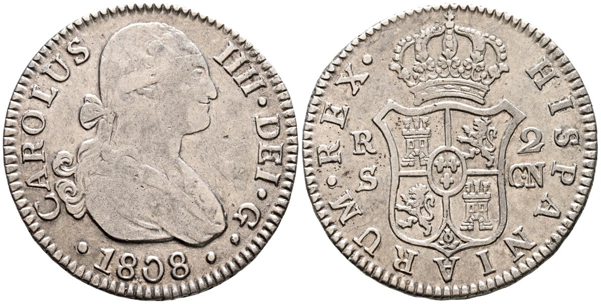 CARLOS IV (1788-1808). 2 Reales. (Ar. 5,82g/27mm). 1808. Sevilla CN. (Cal-2019-722). MBC/MBC+. Ligeros restos de brillo original.