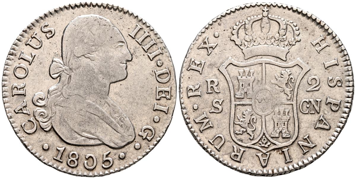 CARLOS IV (1788-1808). 2 Reales. (Ar. 5,94g/26mm). 1805. Sevilla CN. (Cal-2019-725). MBC+. Ligeros restos de brillo original.