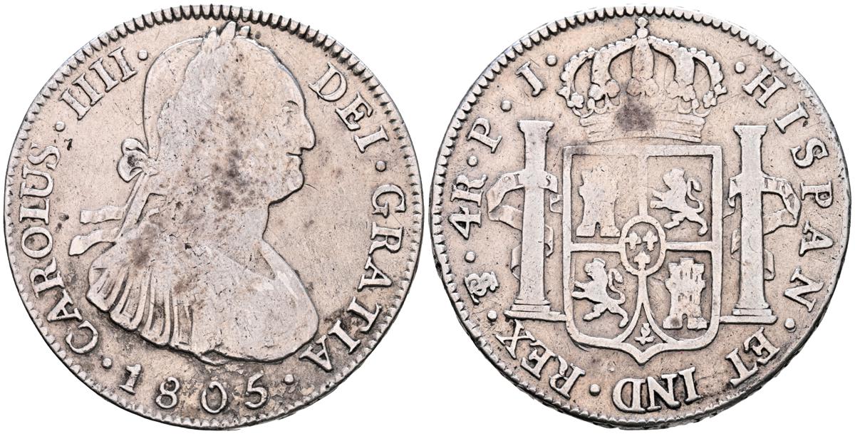 CARLOS IV (1788-1808). 4 Reales. (Ar. 12,96g/33mm). 1805. Potosí PJ. (Cal-2019-840). BC+. Limpiada.