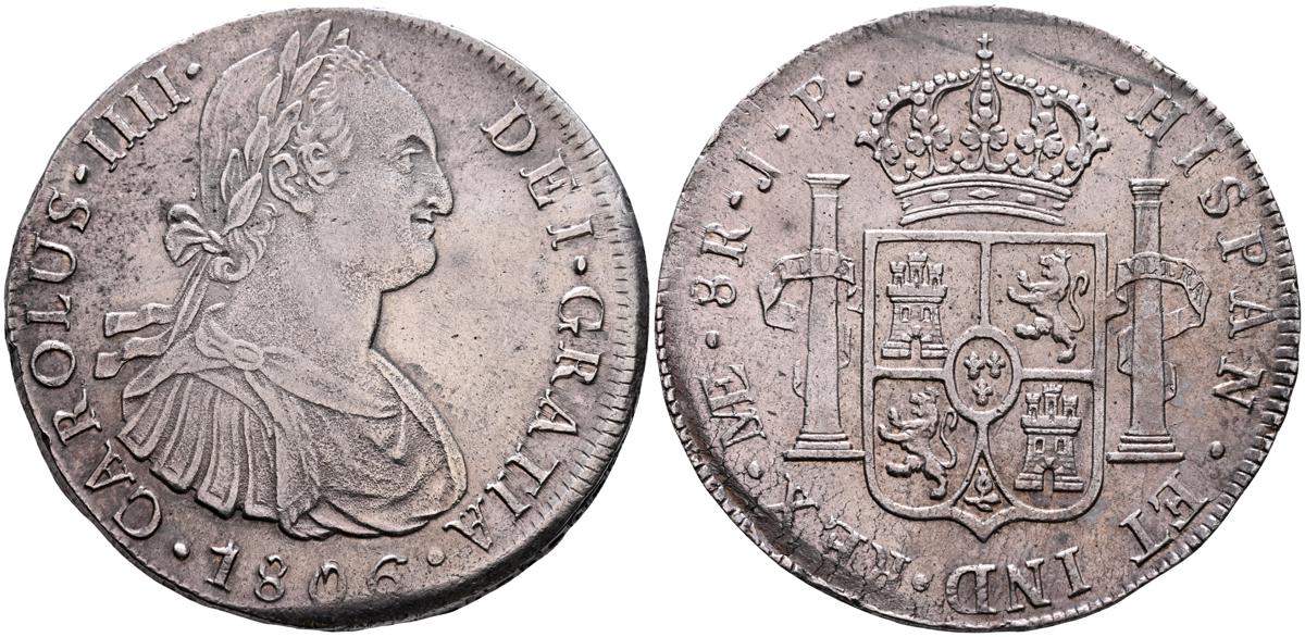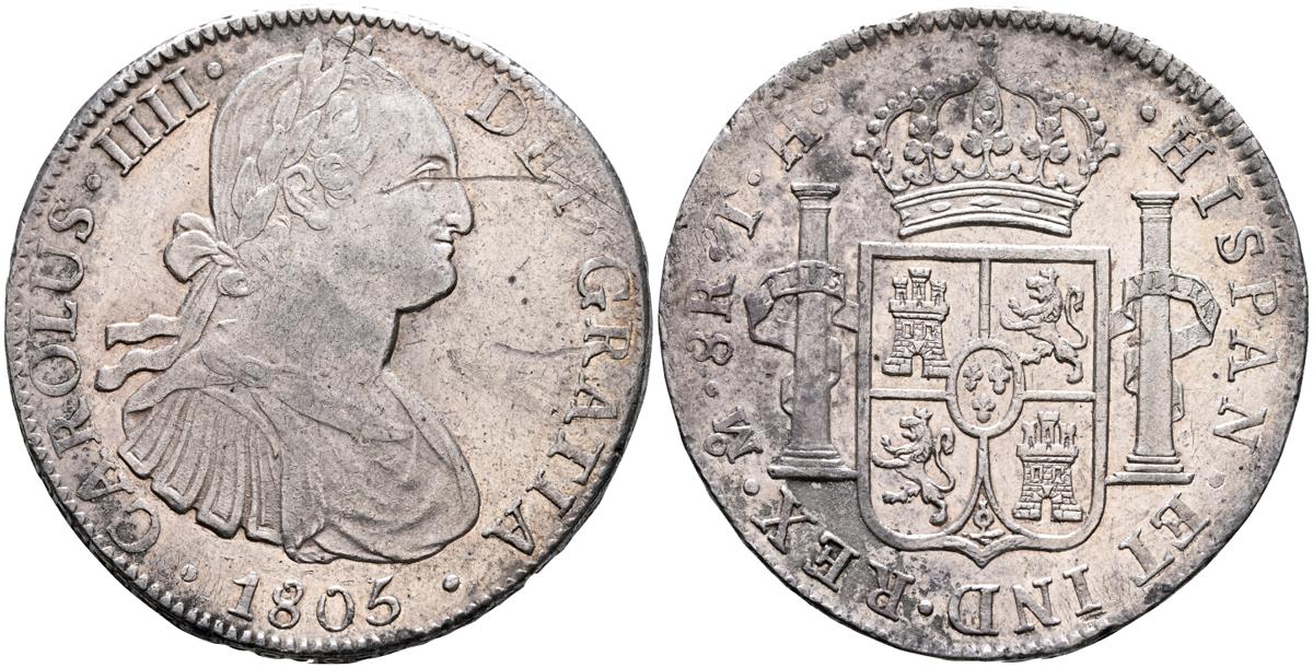 CARLOS IV (1788-1808). 8 Reales. (Ar. 26,99g/39mm). 1805. México TH. (Cal-2019-983). EBC-/EBC. Rayas en anverso. Bonito ejemplar, con un precioso brillo original.