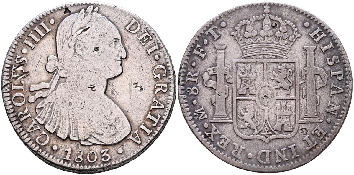 CARLOS IV (1788-1808). 8 Reales. (Ar. 26,53g/40mm). 1803. Mexico FT. (Cal-2019-977). BC+/MBC-. Pequeños resellos. Limpiado.