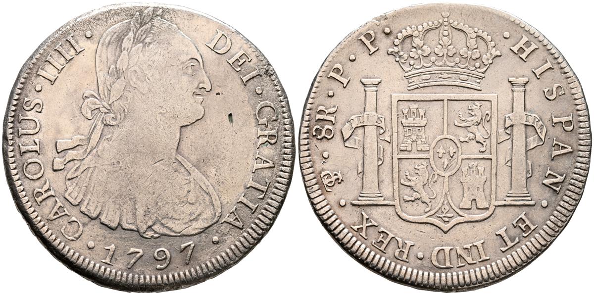 CARLOS IV (1788-1808). 8 Reales. (Ar. 26,76g/39mm). 1797. México FM. (Cal-2019-960). MBC+/EBC-. Atractivo reverso con restos de brillo original.