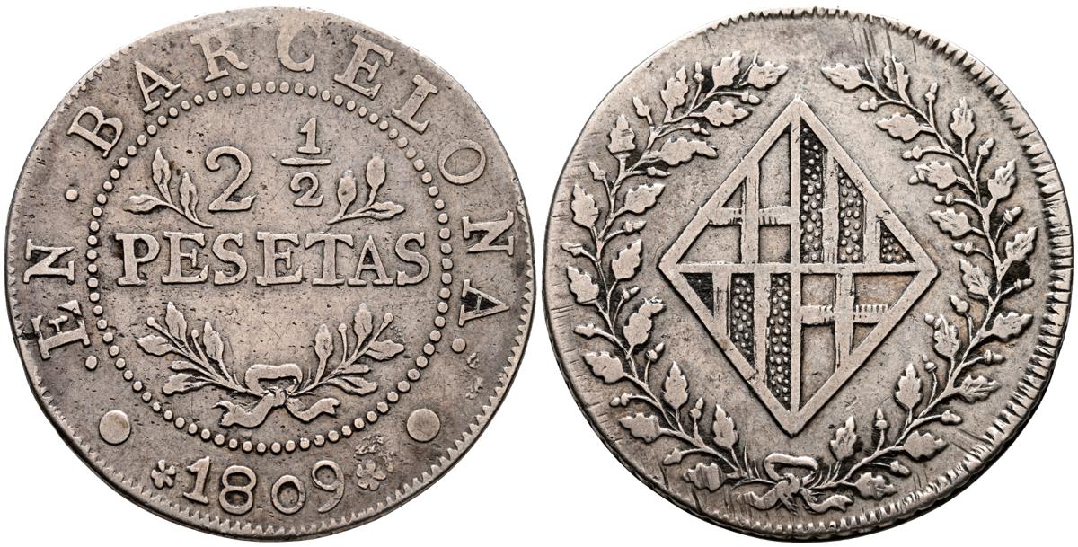 CATALUÑA NAPOLEÓNICA (1808-1814). 2 1/2 Pesetas. (Ar. 13,21g/32mm). 1809. Barcelona. (Cal-2019-42). MBC.