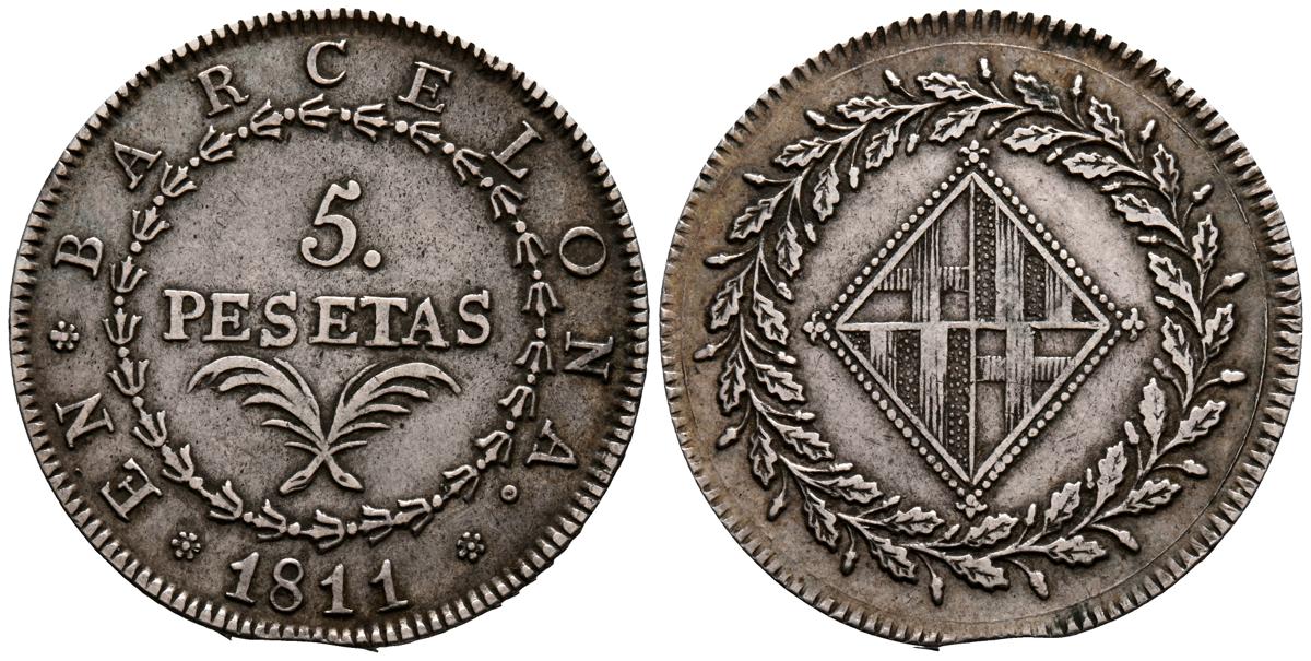 CATALUÑA NAPOLEONICA (1808-1814). 5 Pesetas. (Ar. 26,94g/39mm). 1811. Barcelona. (Cal-2019-47). 25 Rosetas. MBC.