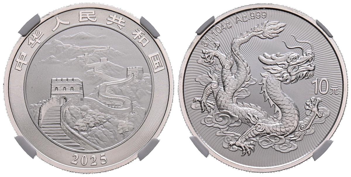 CHINA. 10 Yuan. (Ar. 31,10g/40mm)*. 2025. Chinese Dragon. First Day of Issue. Encapsulado por NGC MS 70. *Peso y medidas teóricos.