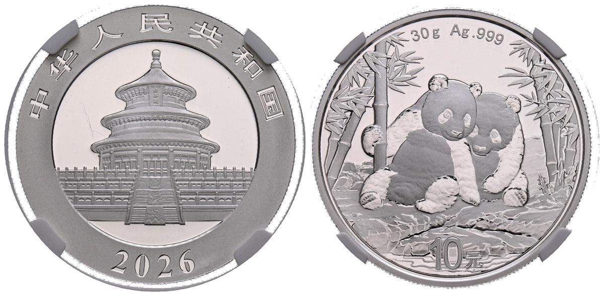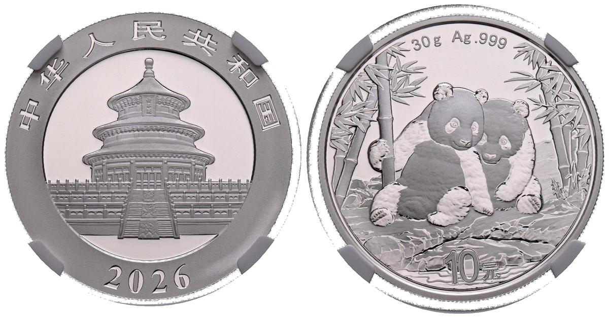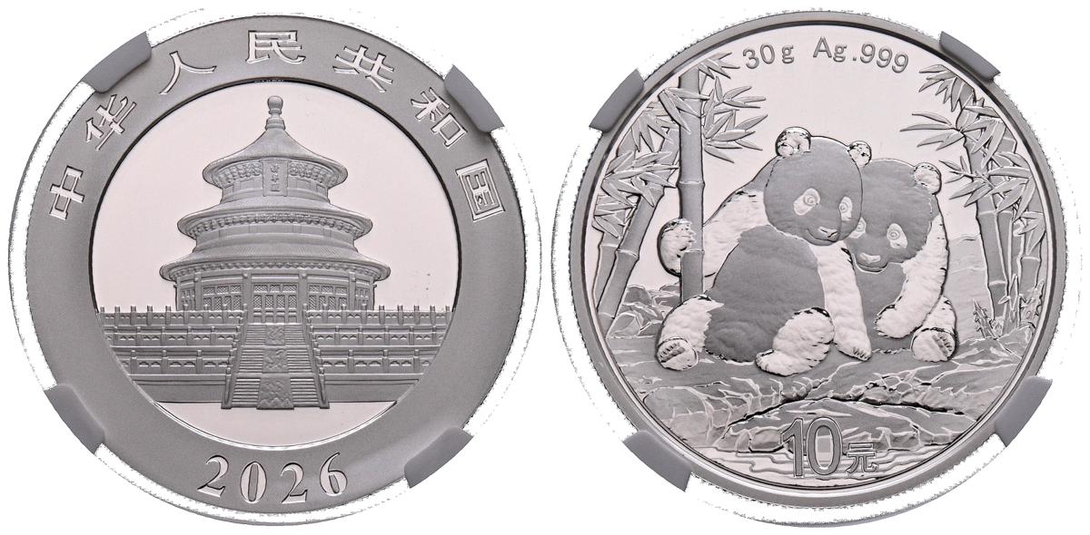 CHINA. 10 Yuan. (Ar. 30,00g/40mm)*. 2026. Serie Panda. First Day of Issue. Encapsulado por NGC MS 70. *Peso y medidas teóricos.