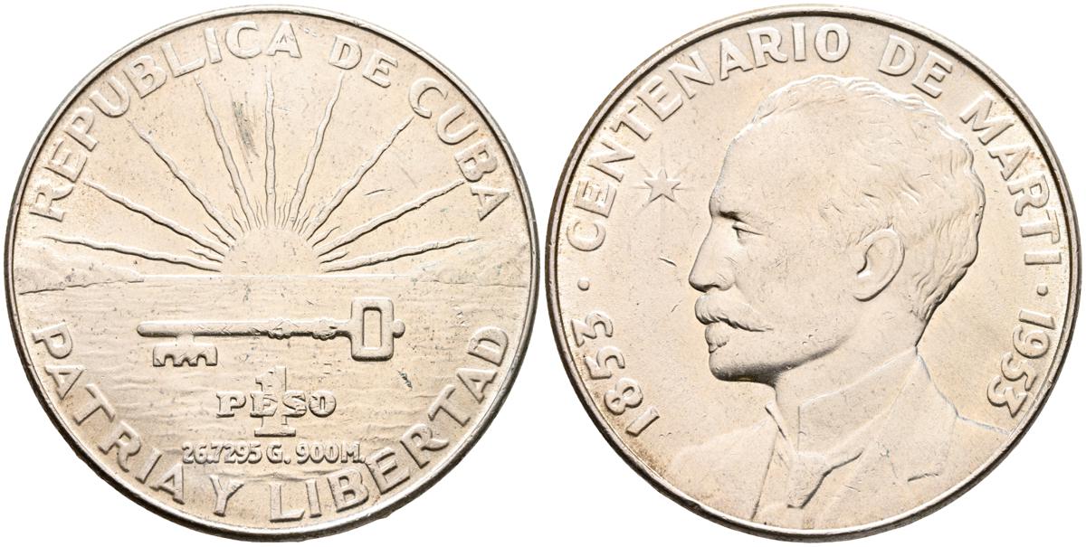 CUBA. 1 Peso. (Ar. 26,74g/38mm). 1953. Centenario del Nacimiento de José Martí (1853-1953). (Km#29). EBC-. Marquitas en anverso.