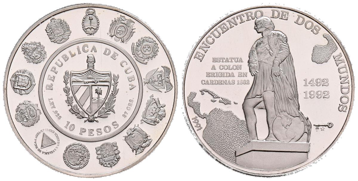 CUBA. 10 Pesos. (Ar. 27,00g/40mm)*. 1991. Encuentro de Dos Mundos. (Km#337). Encapsulada por PCGS PR 68DCAM. *Peso y medidas teóricos.