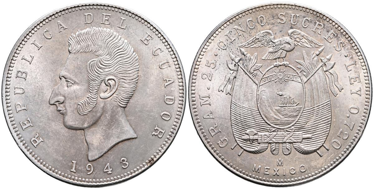ECUADOR. 5 Sucres. (Ar. 25,02g/33mm). 1943. Acuñada en México. (Km#79). EBC+.