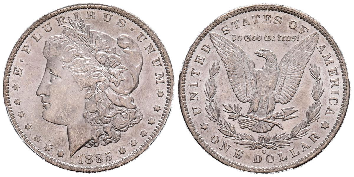 ESTADOS UNIDOS. 1 Dollar. (Ar. 27,00g/38mm)*. 1885. Nueva Orleans. (Km#110). Encapuslado por PCGS MS 64. *Peso y medidas teóricos