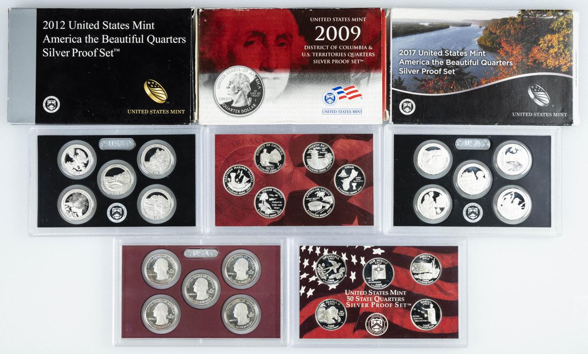 ESTADOS UNIDOS. Conjunto de 5 Sets diferentes de Quarters Dollar (2008,2009,2010, 2012 y 2017). 5 Piezas por set. PROOF. 2 de los estuches no presentan el envoltorio de cartón.