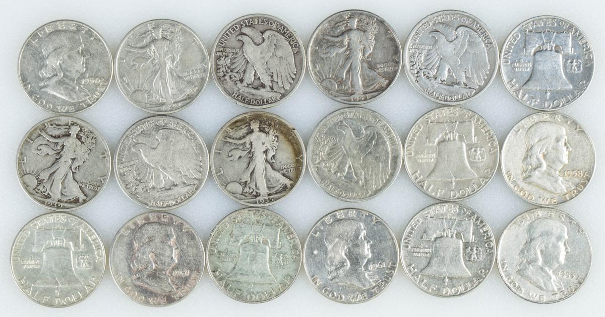 ESTADOS UNIDOS. Conjunto de 18 monedas de plata de 1/2 Dollar, tipo Franklin (10) y Walking Liberty. Diferentes fechas, cecas así como estados de conservación. A EXAMINAR.