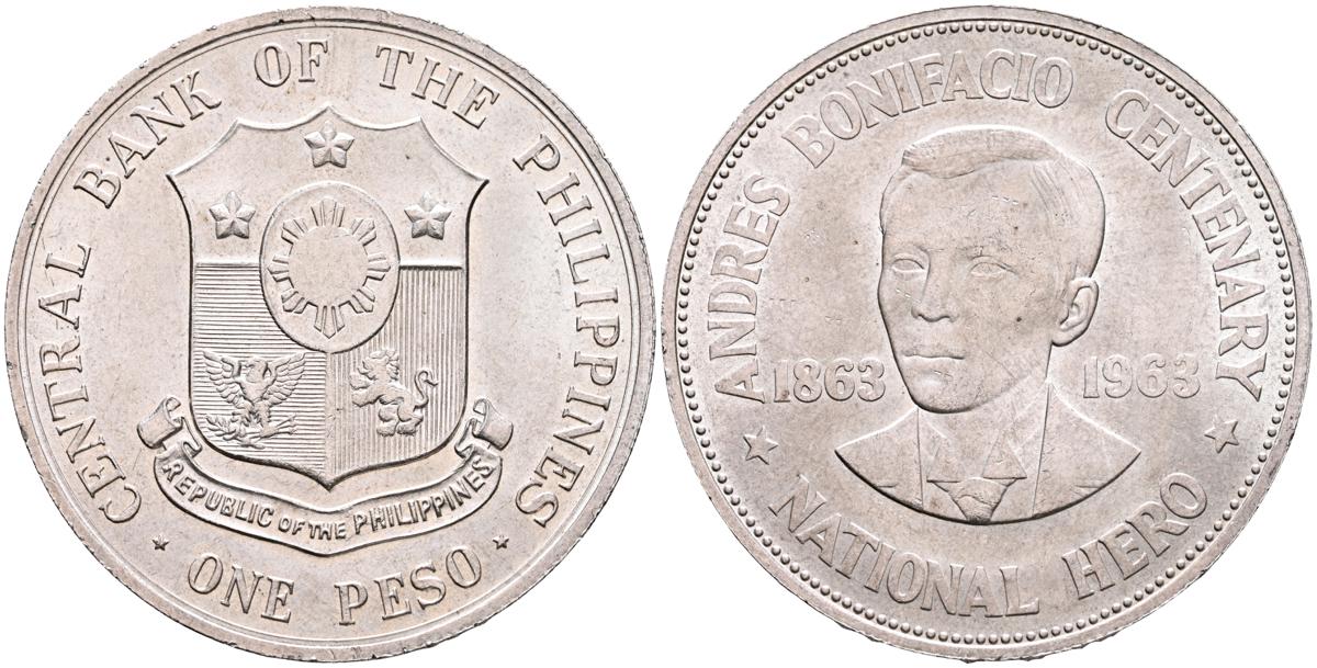 FILIPINAS. 1 Peso. (Ar. 26,72g/33mm). 1963. Centenario del nacimiento de Andrés Bonifacio. (Km#193). SC-.