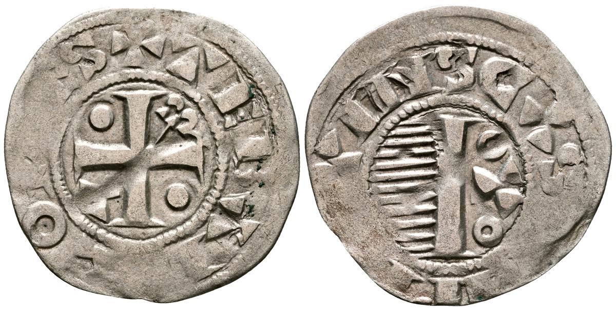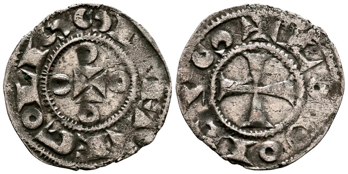 FRANCIA, Condado de La Marche (Angoulème). Óbolo. (Ar. 0,37g/14mm). En nombre de Luis IV de Outre-mer. Siglo XI. (Duplessy 943). Anv: Cruz con media luna arriba y círculos abajo, izquierda y derecha, leyenda alrededor: EGOLISSIME. Rev: Cruz, alrededor de la leyenda: LODOICVS. MBC+. Escasa.