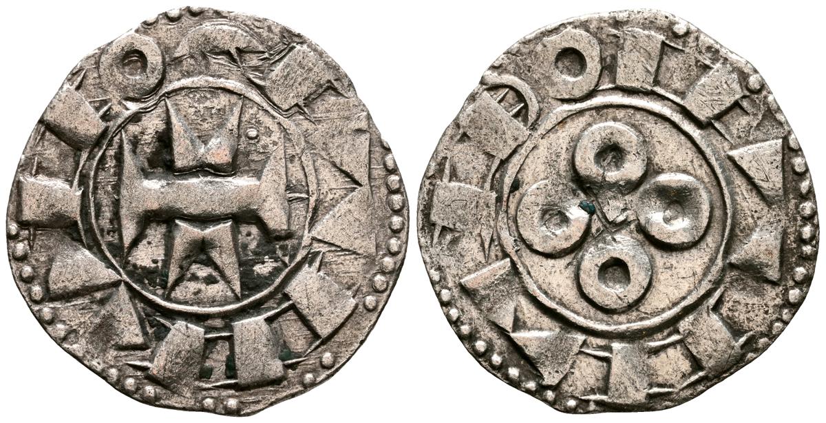 FRANCIA, Condado de Melgueil. Dinero. (Ve. 0,99g/17mm). 1080-1200. (Duplessy 1578). Anv: Cruz formada por un estandarte y dos mitras. Alrededor leyenda: RAMVNDS. Rev: Punto entre cuatro roeles, todo dentro de gráfila circular, alrededor leyenda: NAIDONA. MBC+.