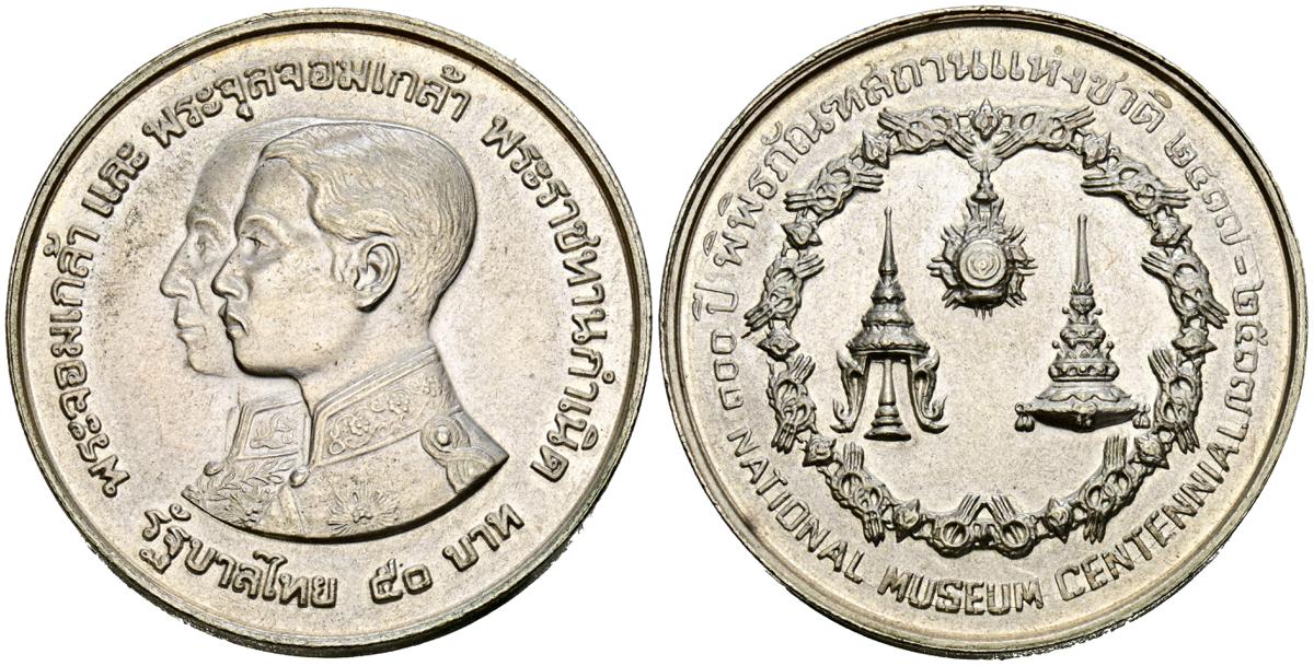 TAILANDIA, Rama IX. 50 Baht. (Ar. 24,90g/39mm). 1974. 100 Aniversario Museo Nacional. (Km#101). EBC+.