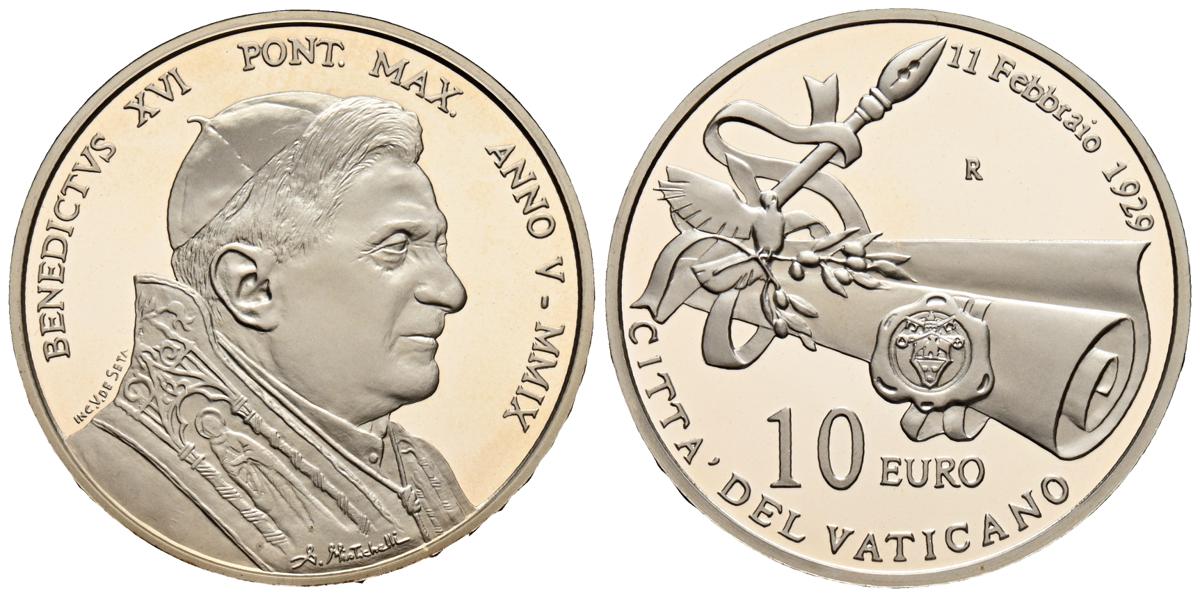VATICANO. 10 Euros. (Ar. 22,00g/34mm). 2009. Benedicto XVI. 80 Aniversario de la Fundación de la Ciudad del Vaticano. PROOF. Incluye estuche original (sin cartón) y certificado de autenticidad. Escasa.