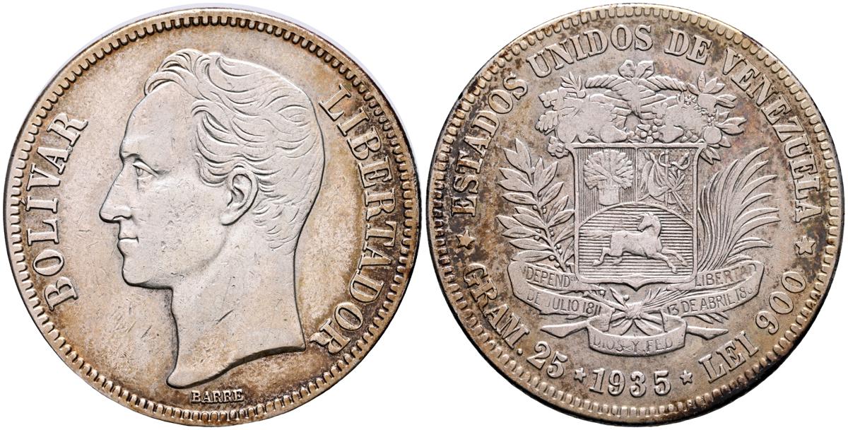 VENEZUELA. 5 Bolívares. (Ar. 24,87g/37mm). 1935. Philadelphia. (Km#24.2). MBC/MBC+. Tono dorado.