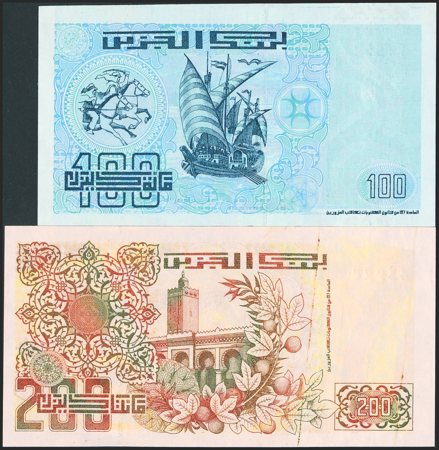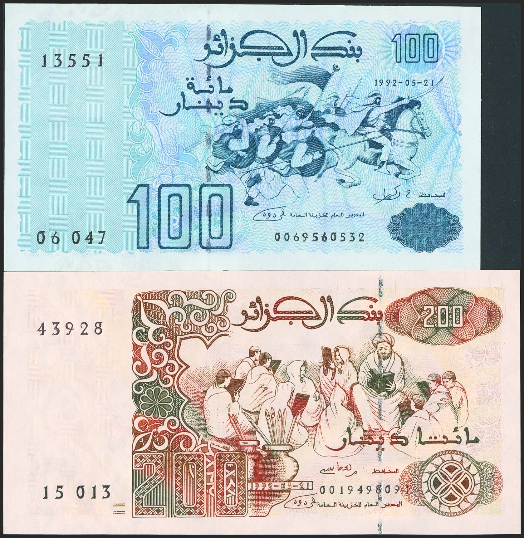 ALGERIA. Lot of 2 notes of 100 and 200 Dinars. 21 May 1992. Bank of Algeria. (Pick: 137, 138). Uncirculated.