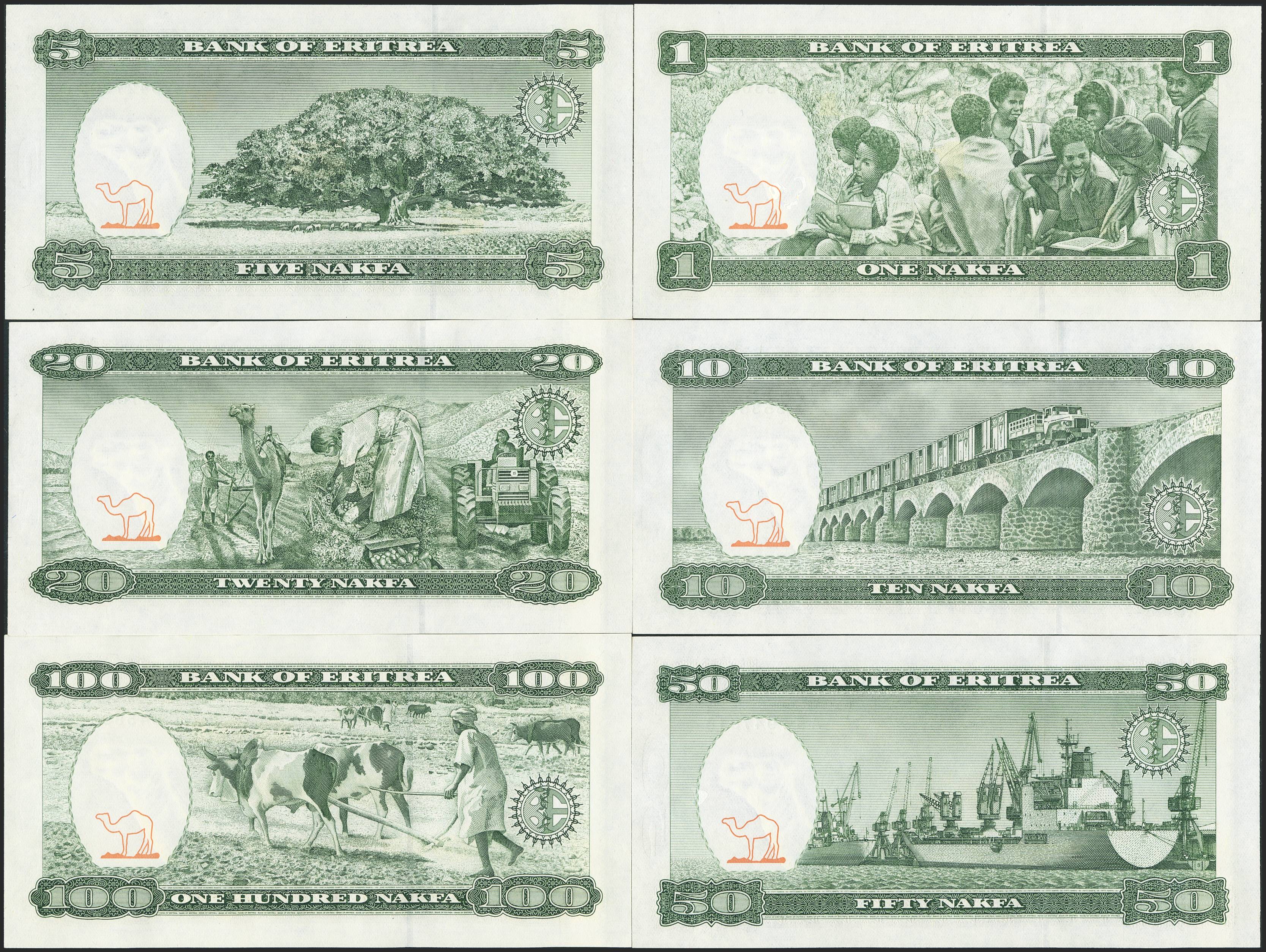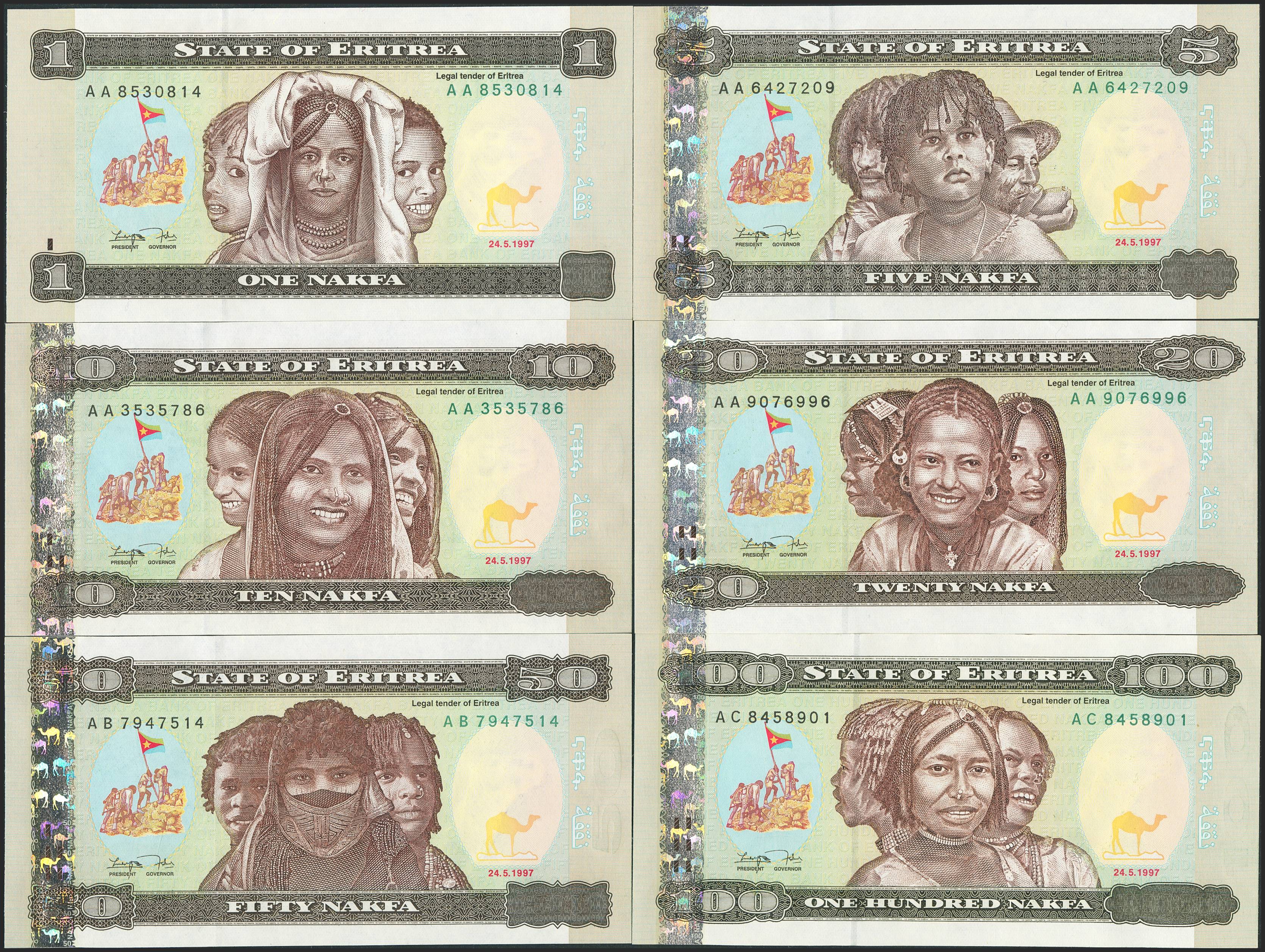 ERITREA. Complete set of 6 notes 1 Nafka, 5 Nafka, 10 Nafka, 20 Nafka, 50 Nafka and 100 Nafka. 1997. Bank of Eritrea. (Pick: 1, 2, 3, 4, 5, 6). Uncirculated.