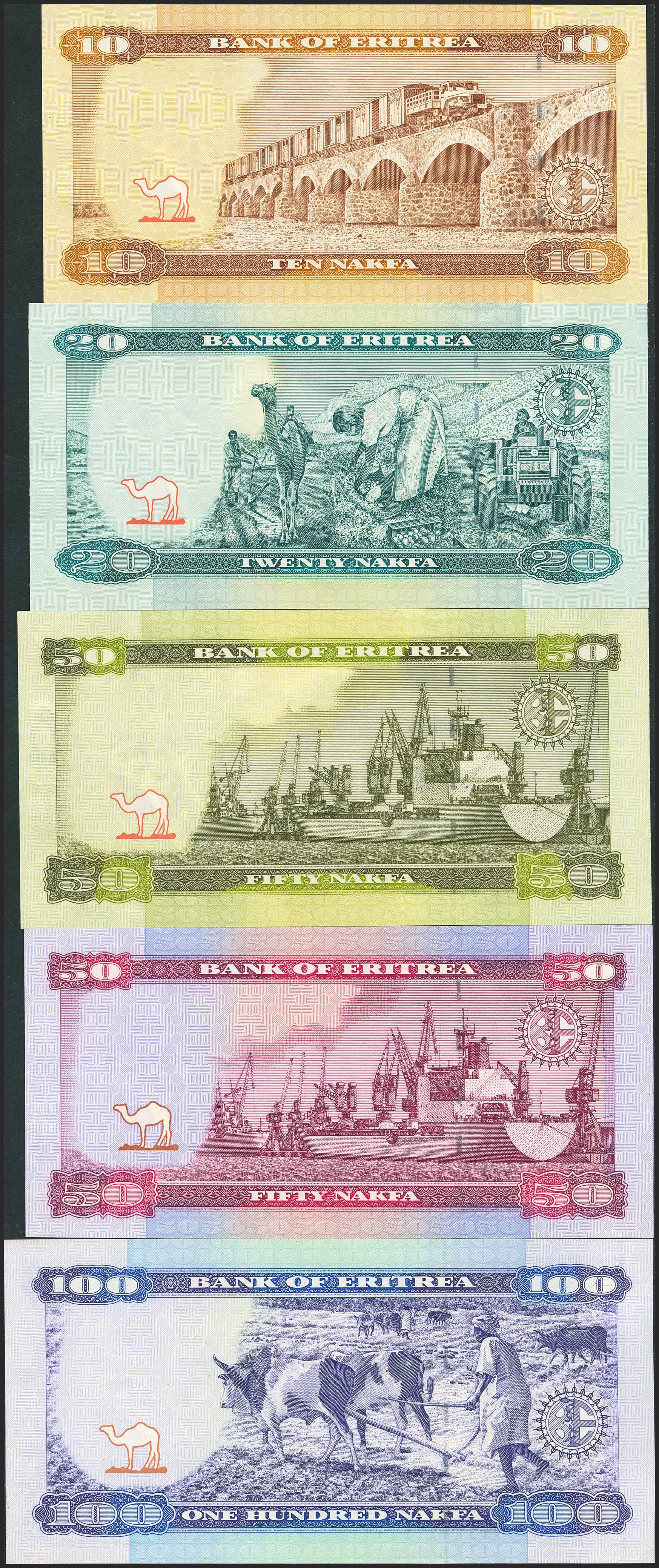 ERITREA. Lot of 5 notes of 10 Nafka, 20 Nafka, 50 Nafka, 50 Nafka and 100 Nafka. (2004ca). Bank of Eritrea. (Pick: 7, 8, 9, 11, 12). Uncirculated.