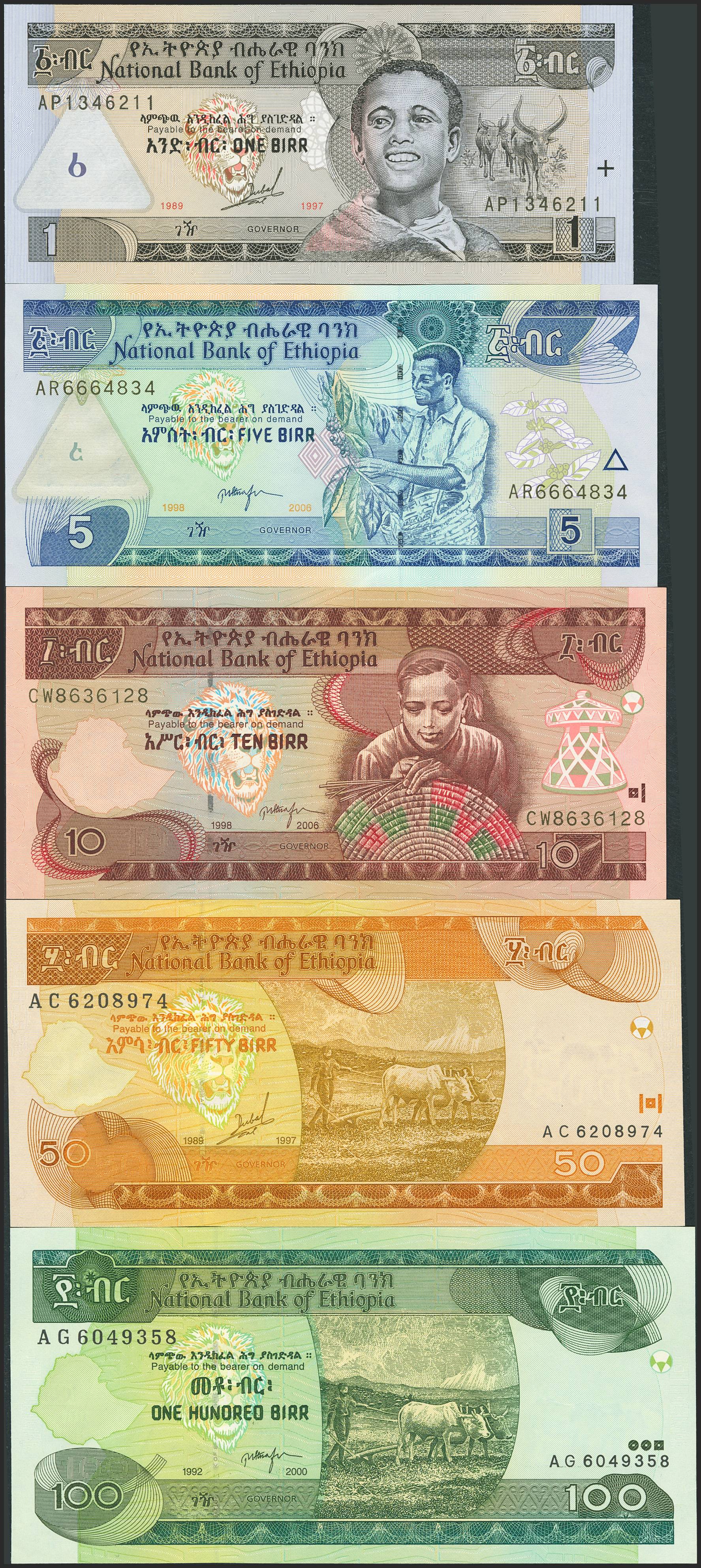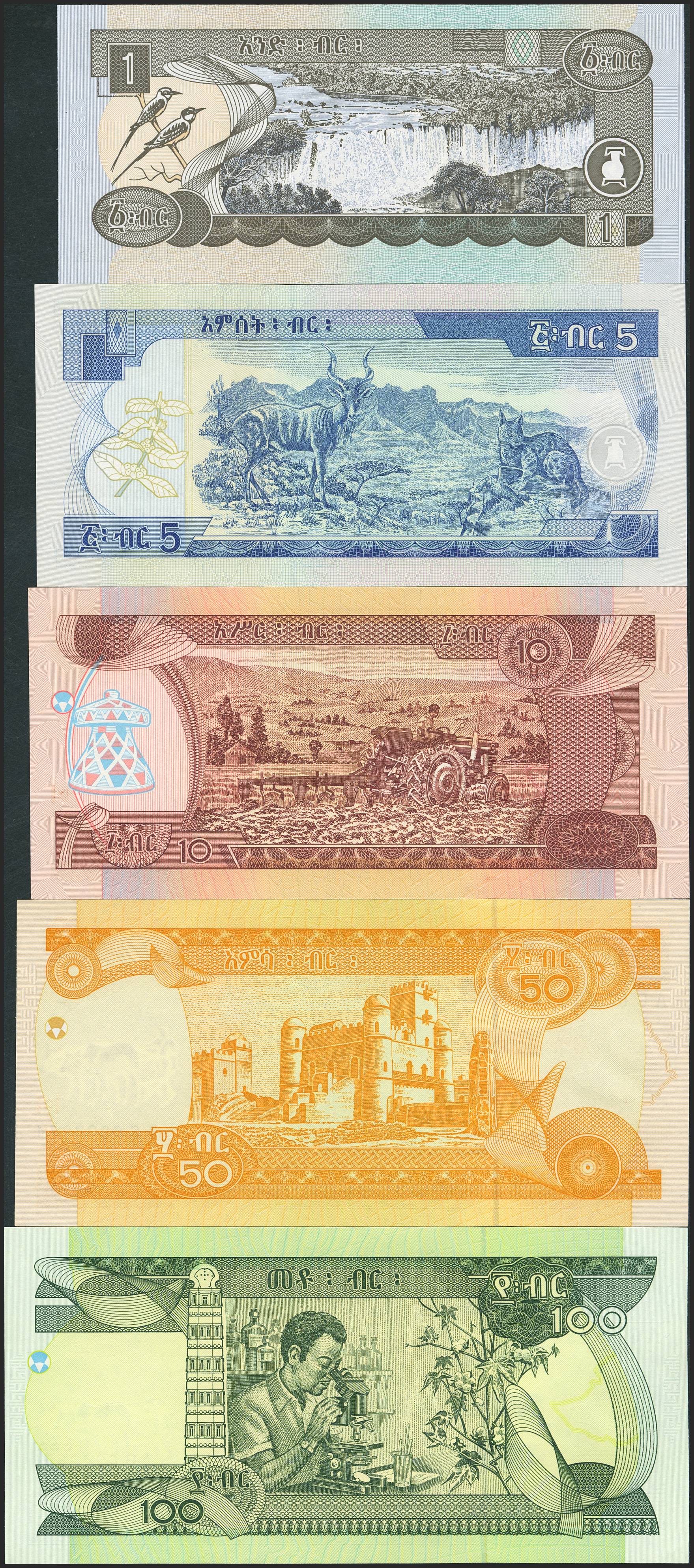 ETHIOPIA. Lot of 5 notes of 1 Birr, 5 Birr, 10 Birr, 50 Birr and 100 Birr. (1997ca). National Bank. (Pick: 46a, 47d, 48d, 49a, 50a). Uncirculated.