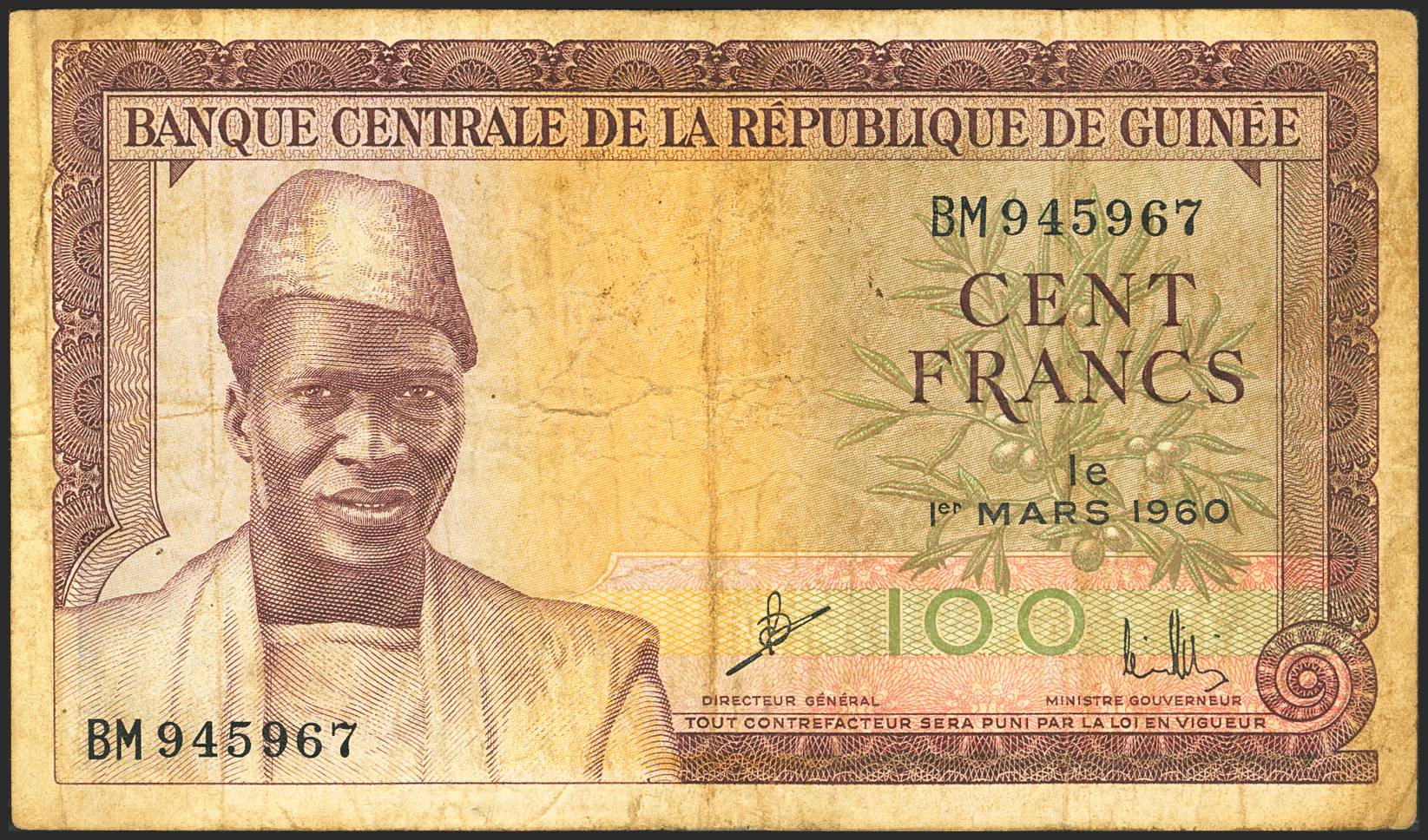 GUINEA. 100 Francs. 1 March 1960. Banque de la Republique. (Pick: 13a). Fine.