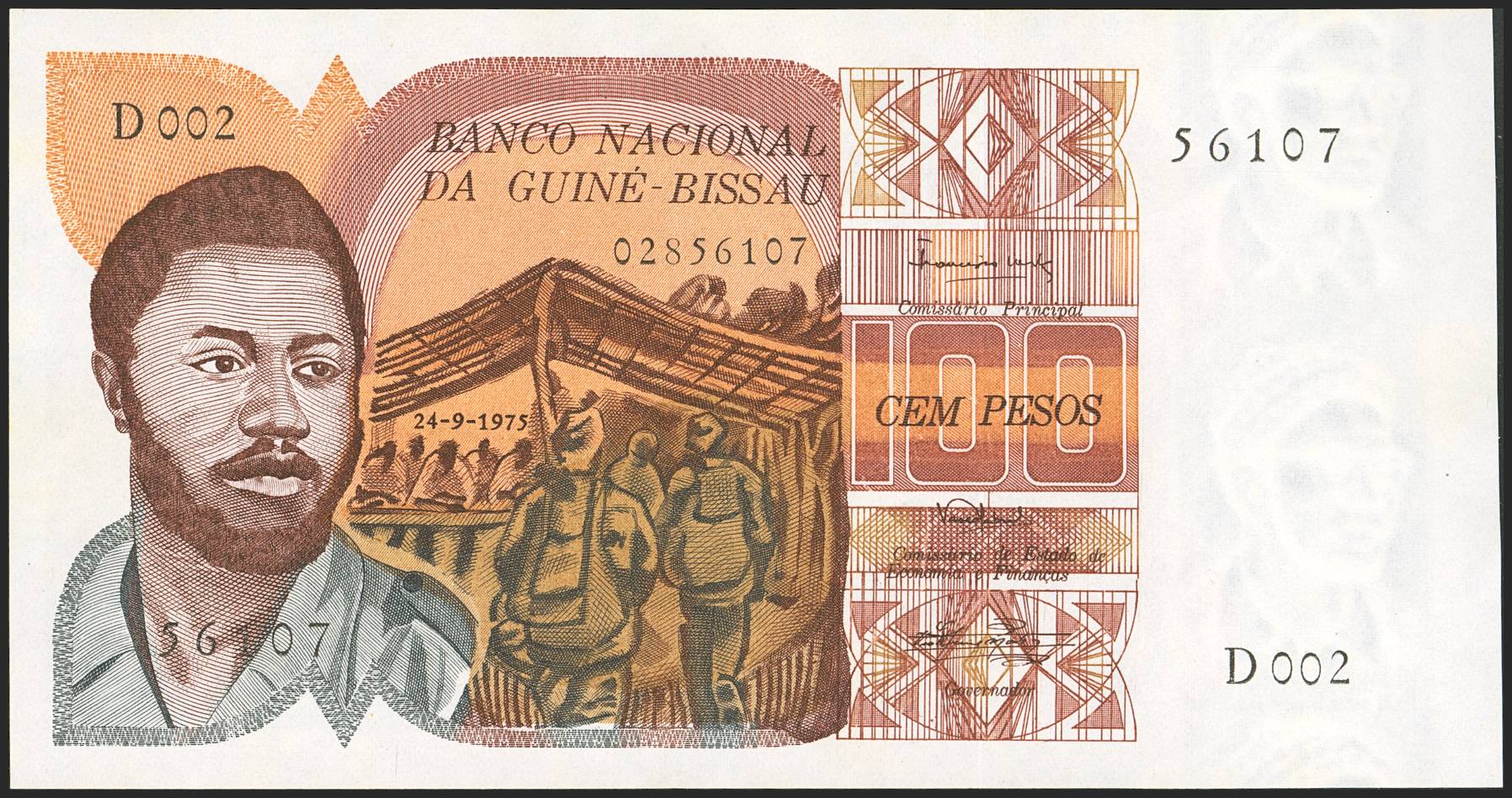 GUINEA-BISSAU. 100 Pesos. 24 September 1975. National Bank. (Pick: 2). About Uncirculated.
