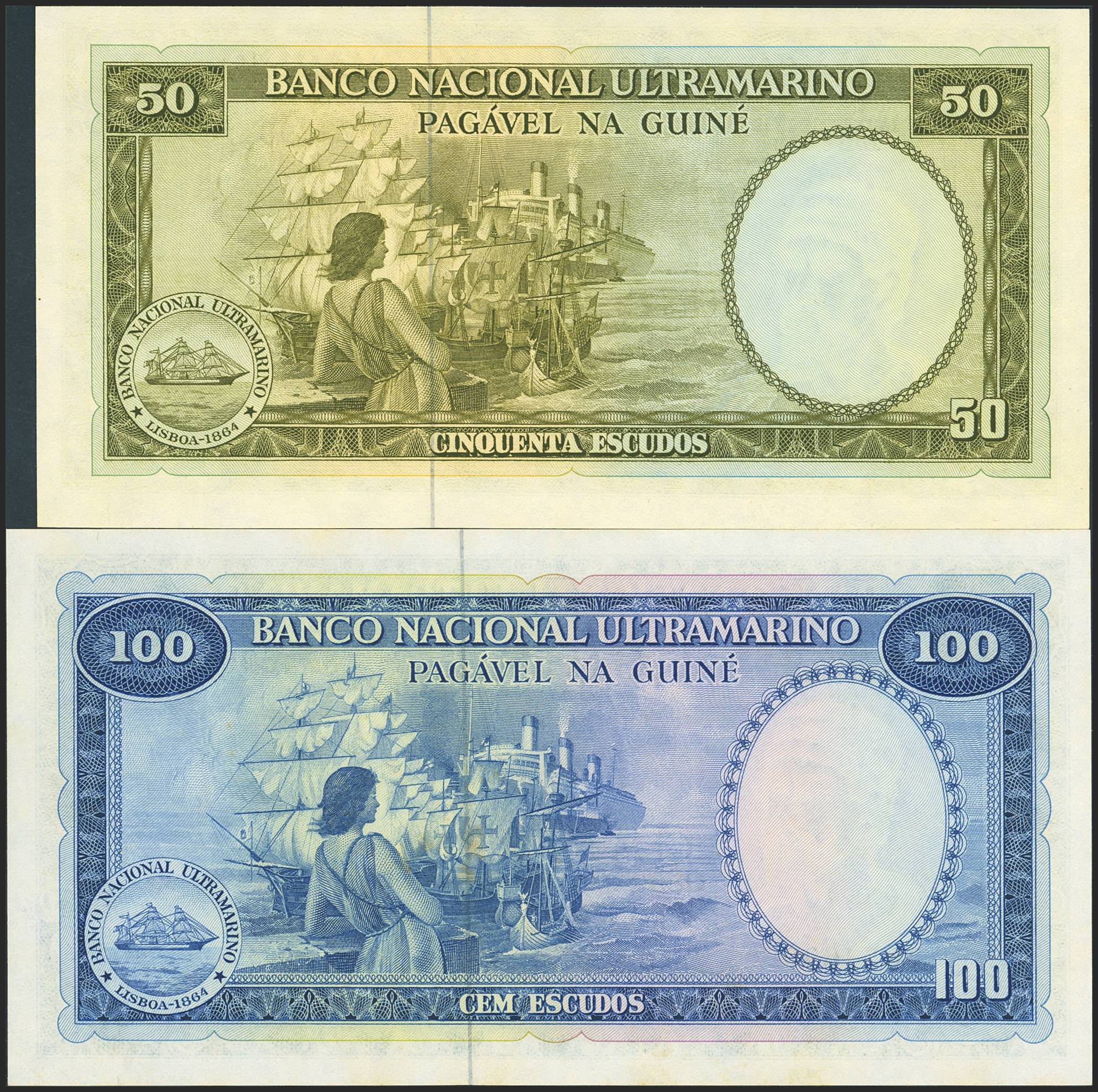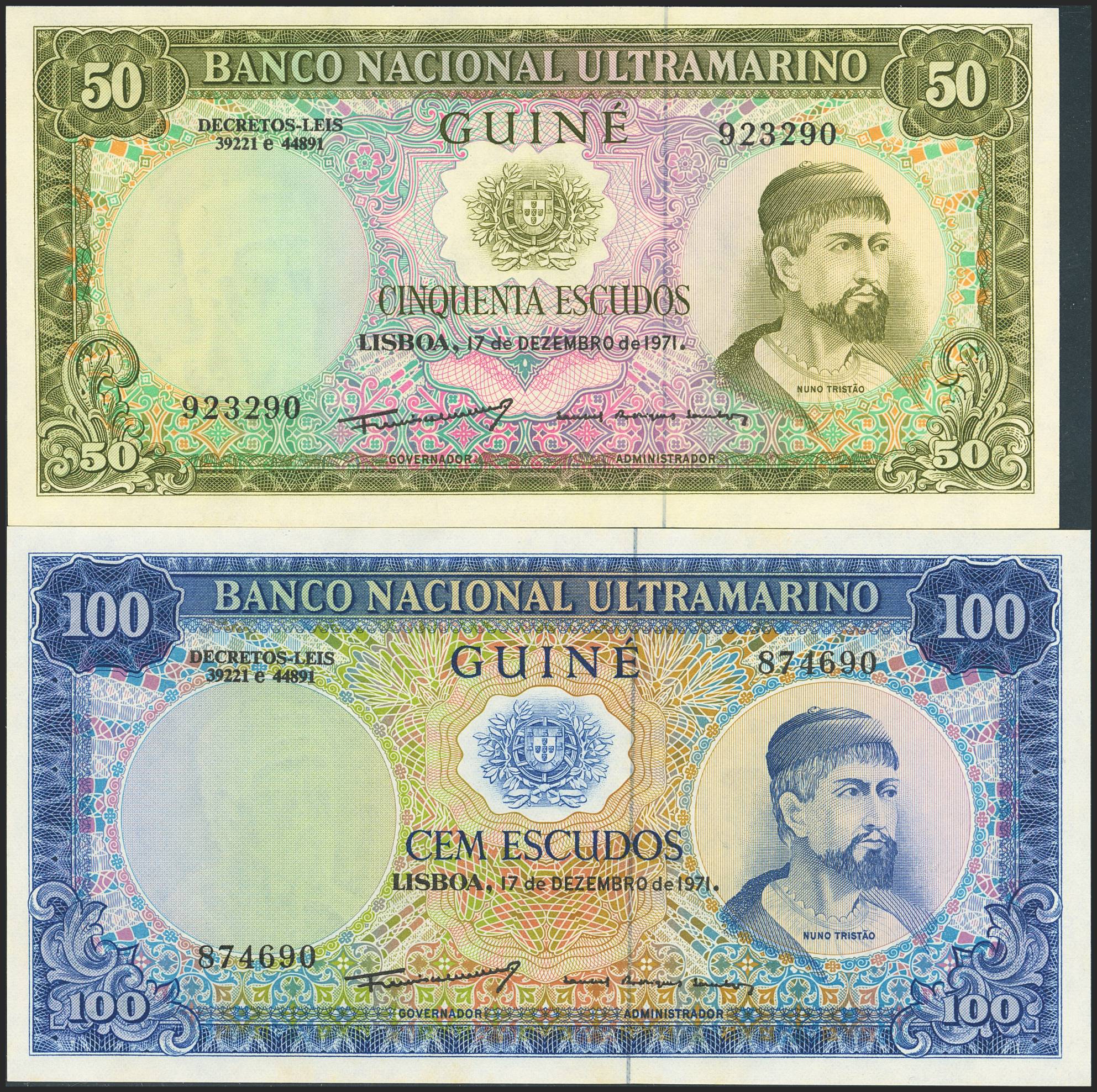 PORTUGUESE GUINEA. Set of 2 notes 50 Escudos and 100 Escudos. 17 Decemebr 1971. Banco Nacional Ultramarino. (Pick: 44a, 45a). Uncirculated.