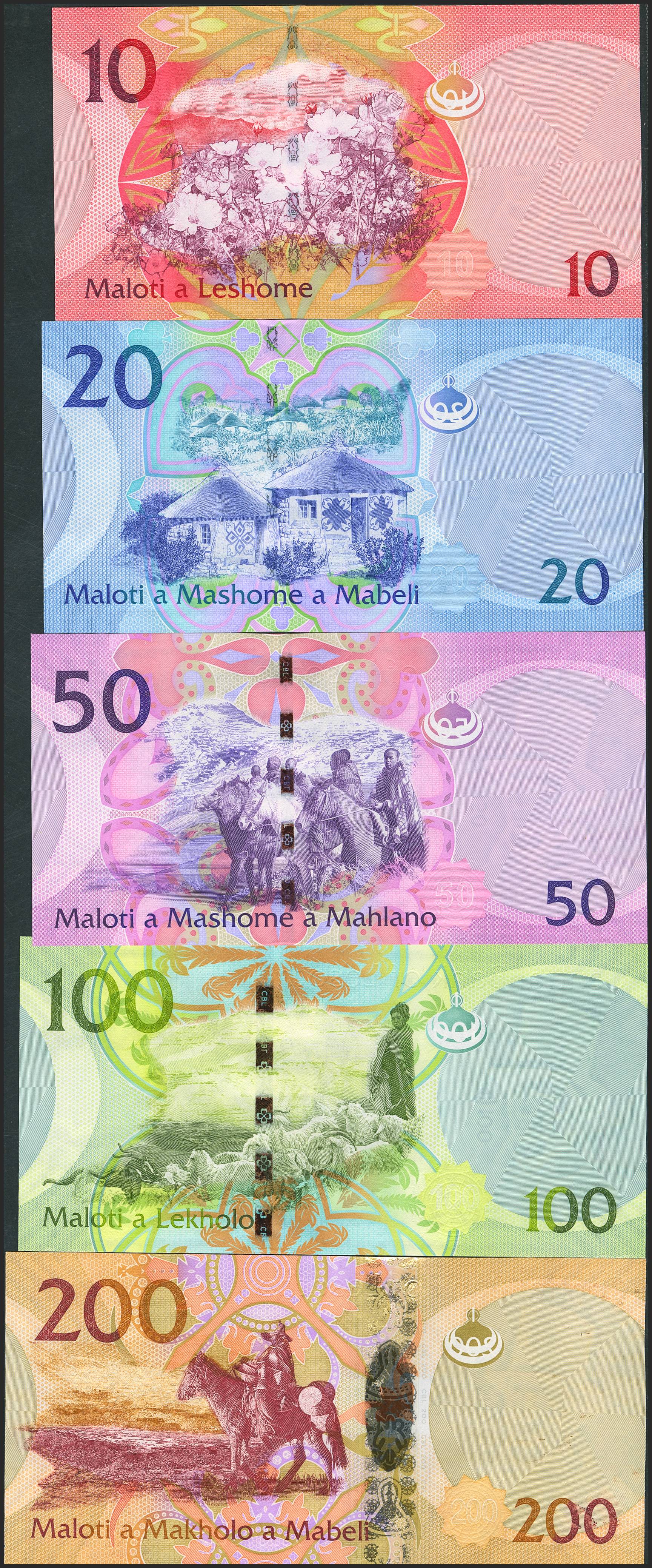 LESOTHO. Lot of 5 notes of 10 Maloti, 20 Maloti, 50 Maloti, 100 Maloti and 200 Maloti. (2010ca). Central Bank. (Pick: 21, 22, 23, 24, 25). Uncirculated.