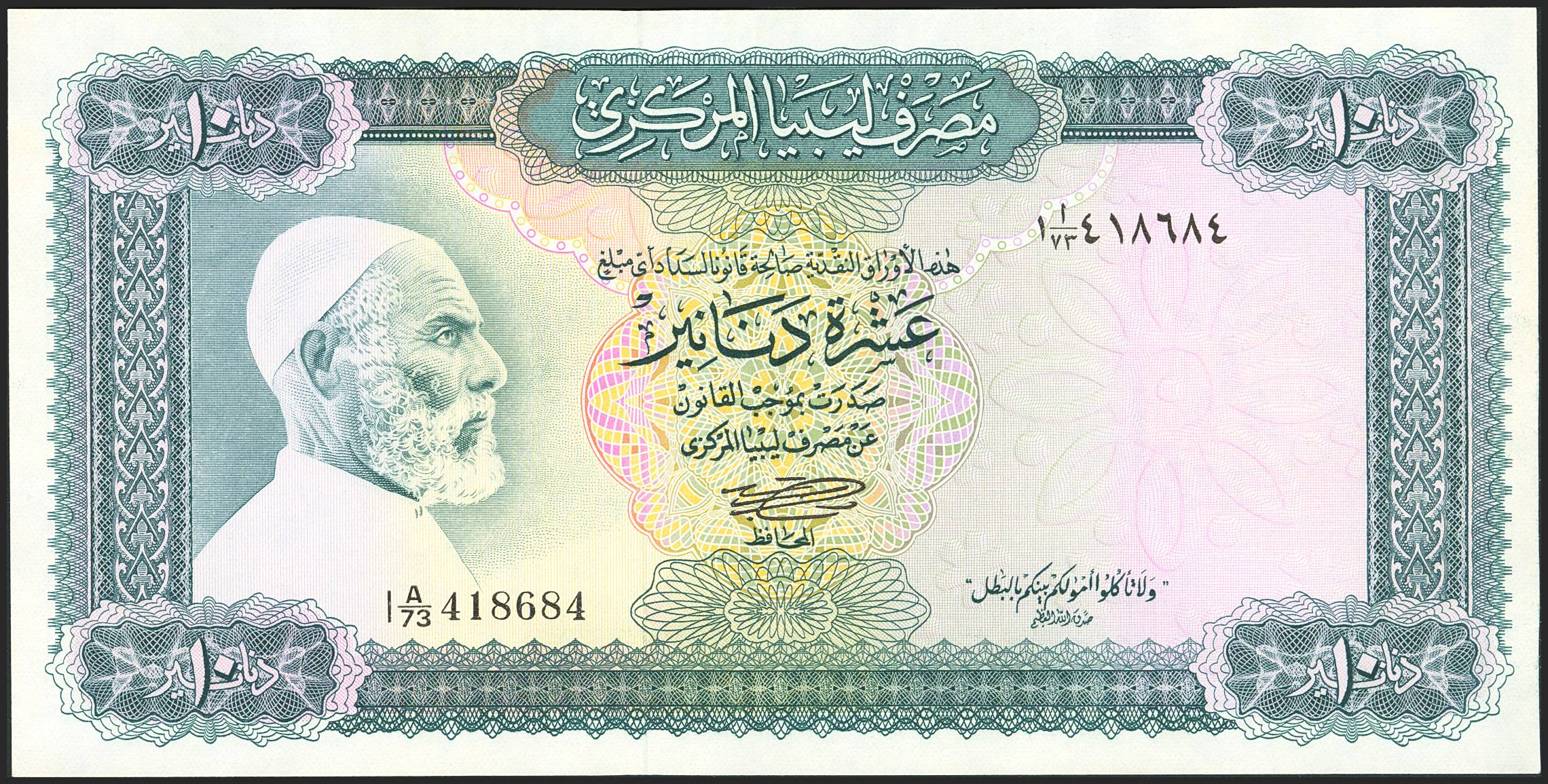 LIBYA. 10 Dinars. (1972ca). Central Bank. (Pick: 37b). Uncirculated.