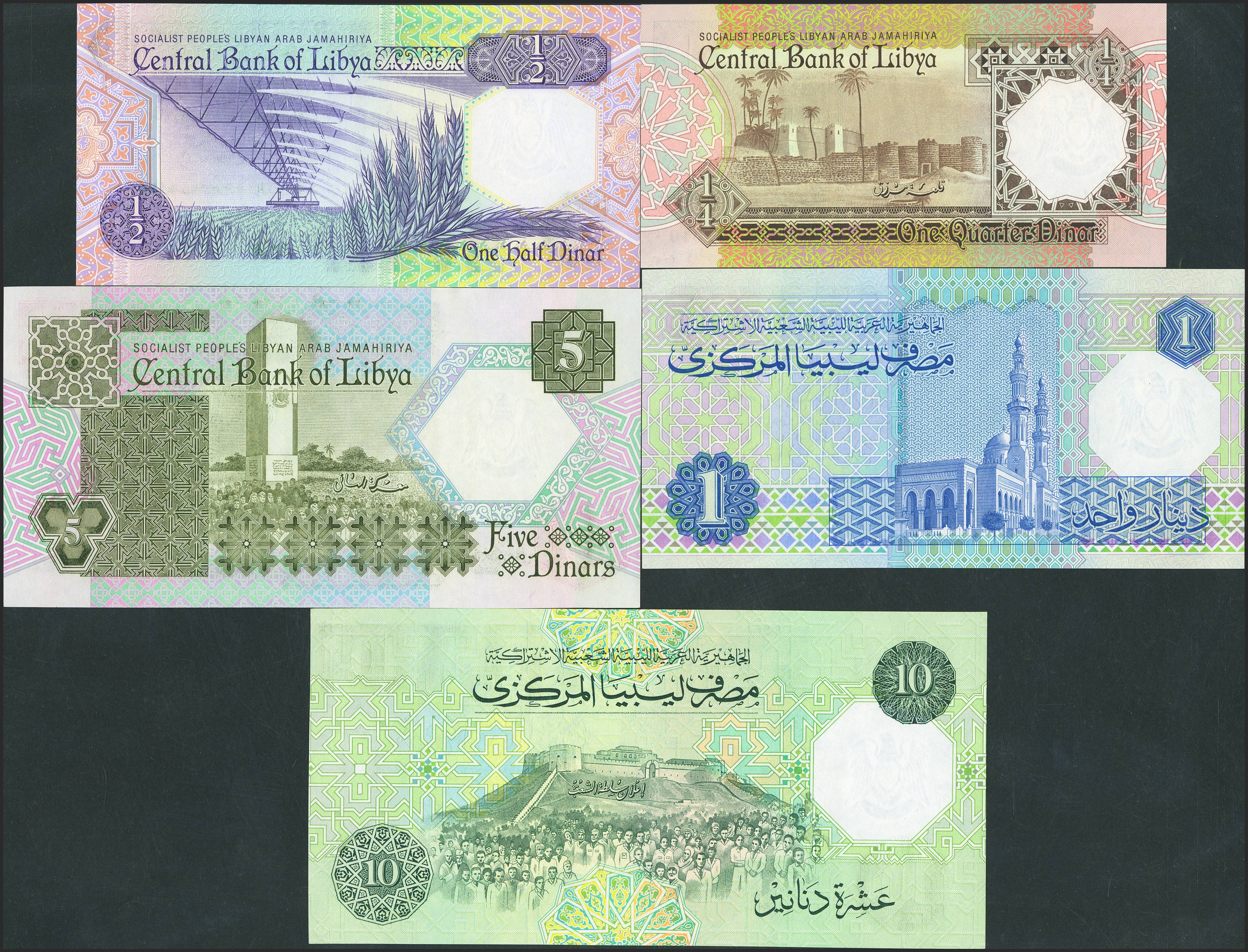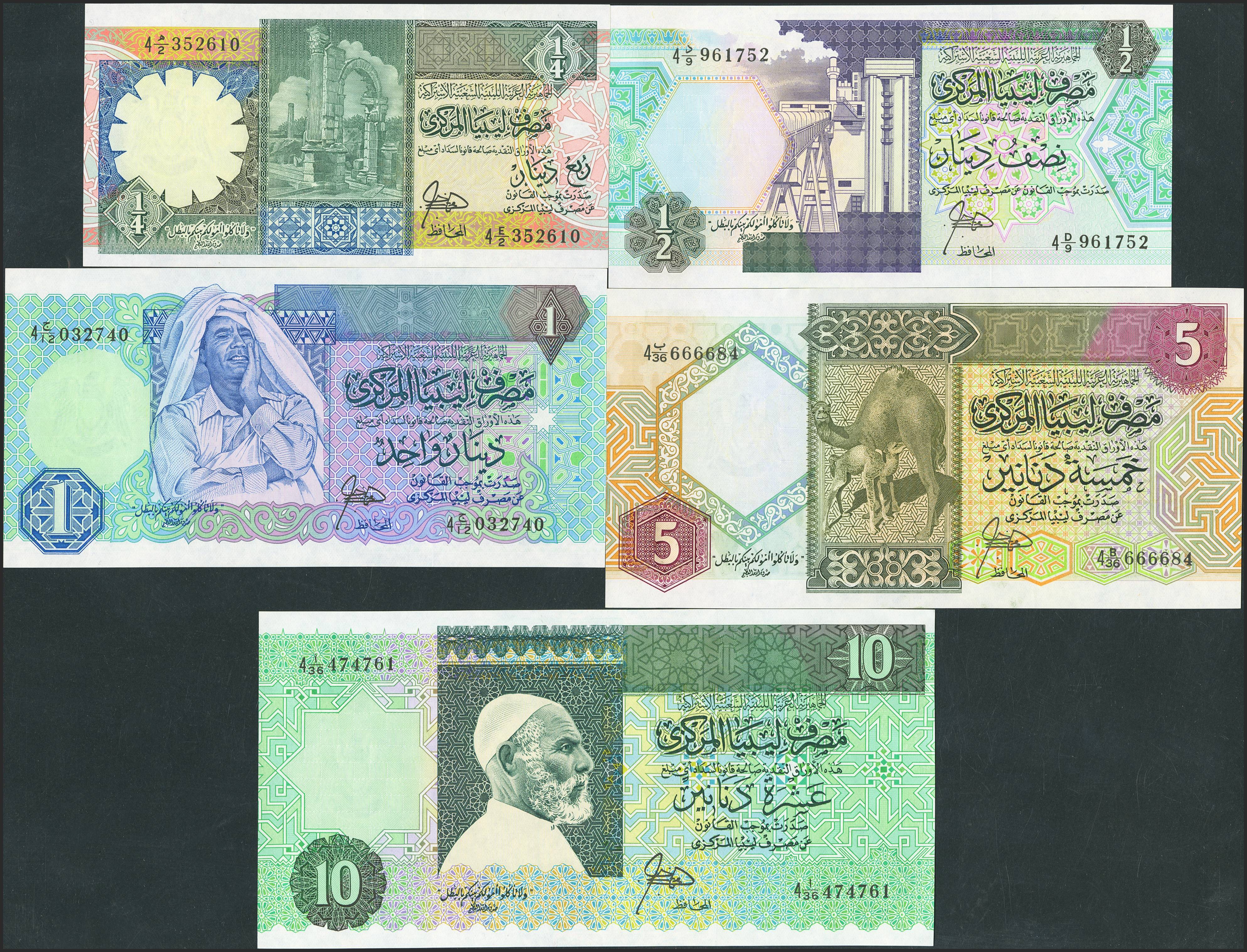 LIBYA. Lot of 5 notes of ¼ Dinar, ½ Dinar, 1 Dinar, 5 Dinars and 10 Dinars. (1991ca). Central Bank. (Pick: 52, 53, 54, 55, 56). Uncirculated.