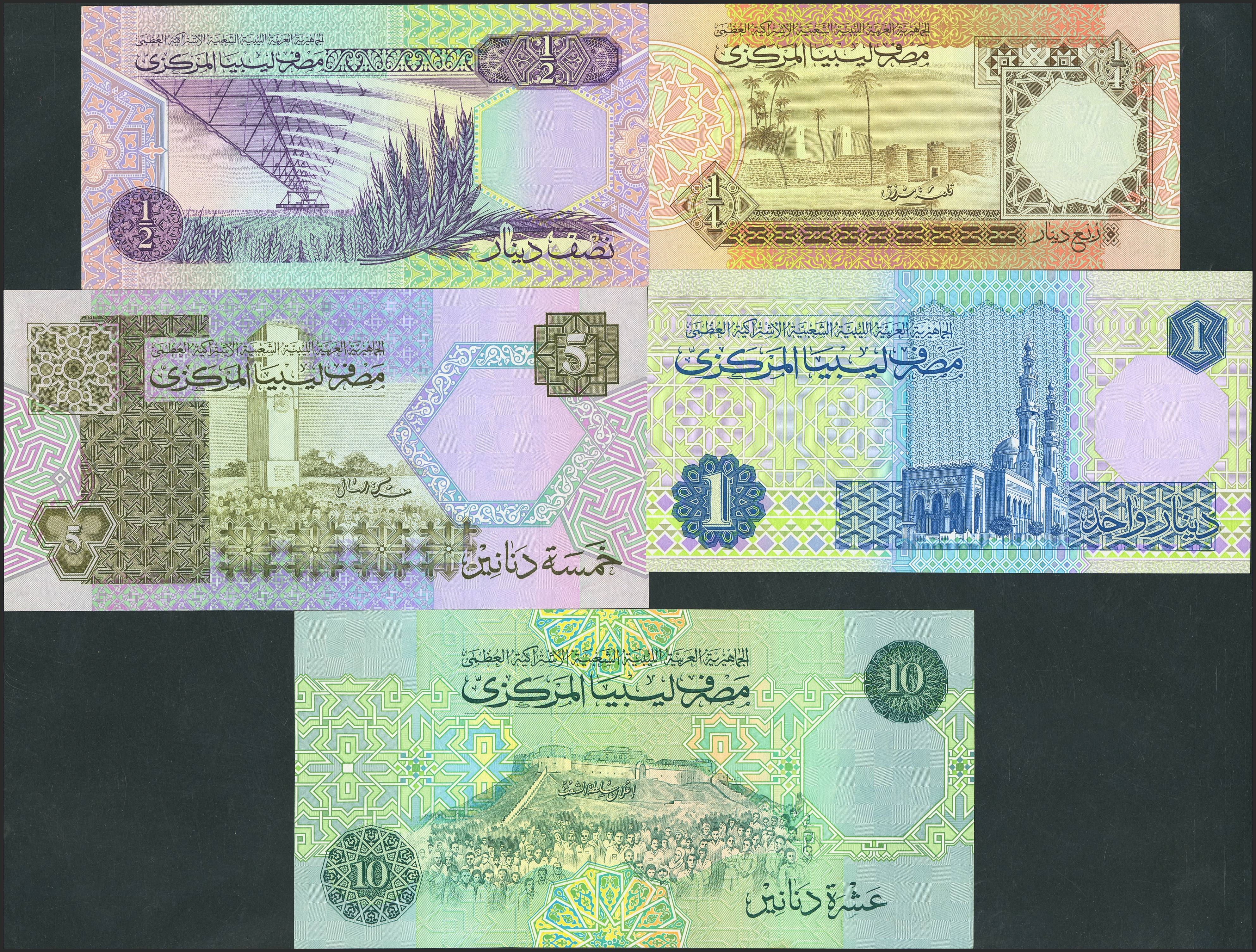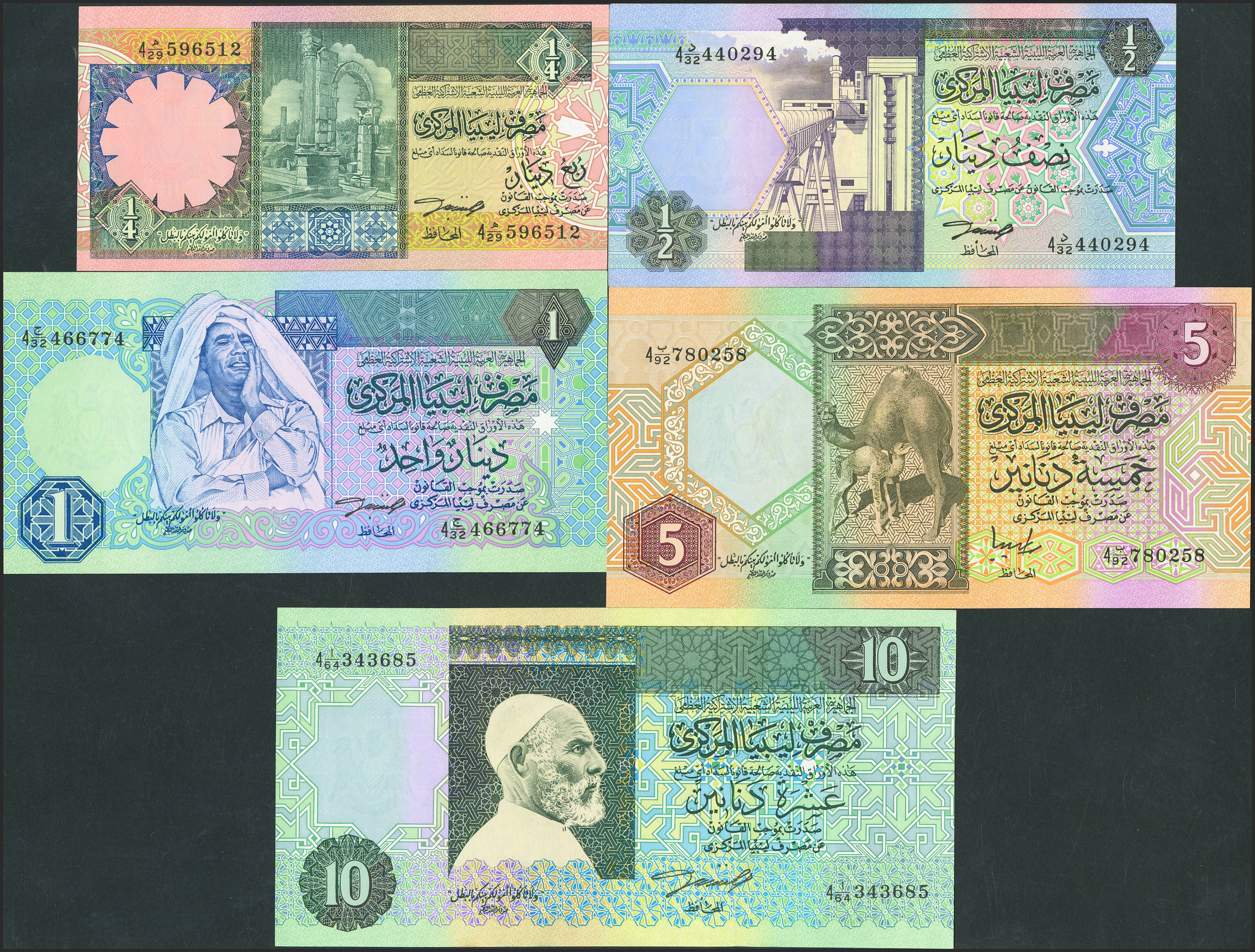 LIBYA. Lot of 5 notes of ¼ Dinar, ½ Dinar, 1 Dinar, 5 Dinars and 10 Dinars. (1991ca). Central Bank. (Pick: 57, 58, 59, 60, 61). Uncirculated / About Uncirculated.