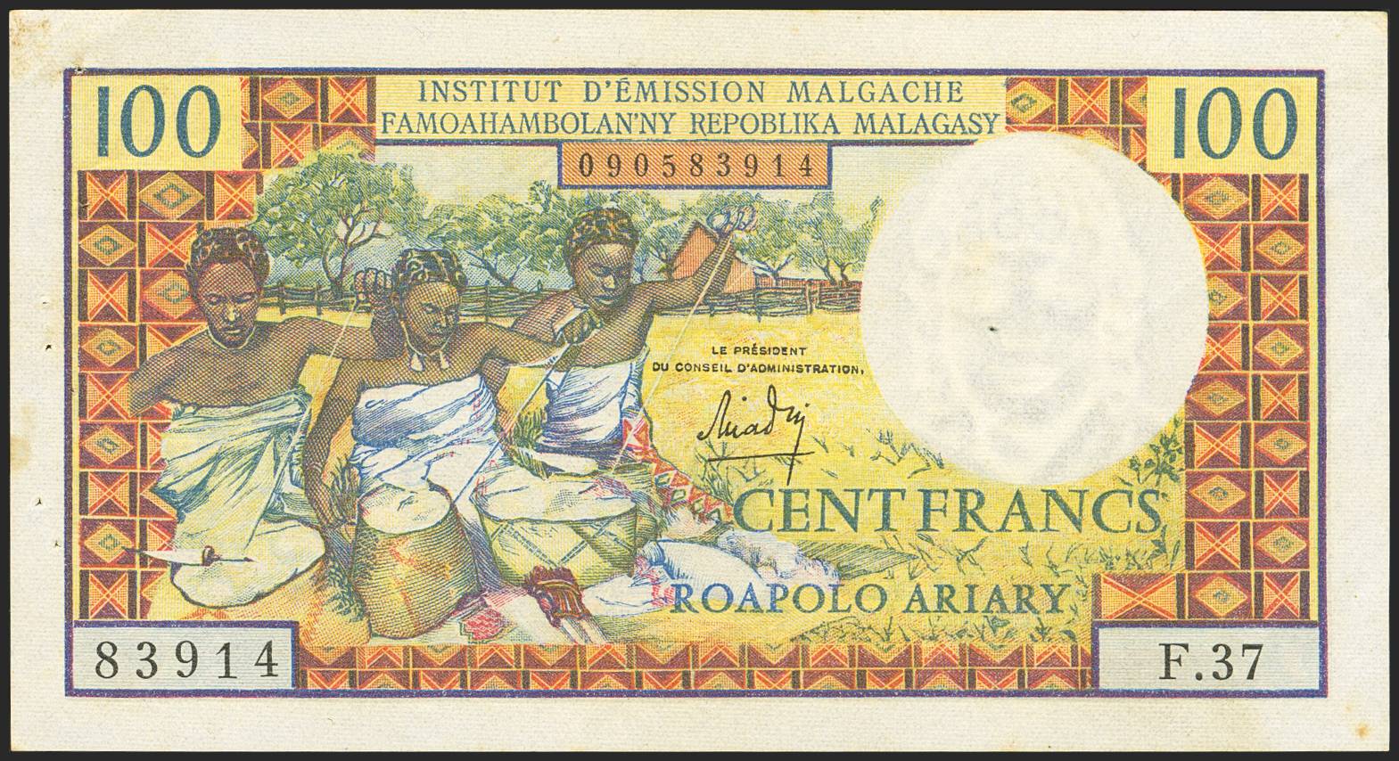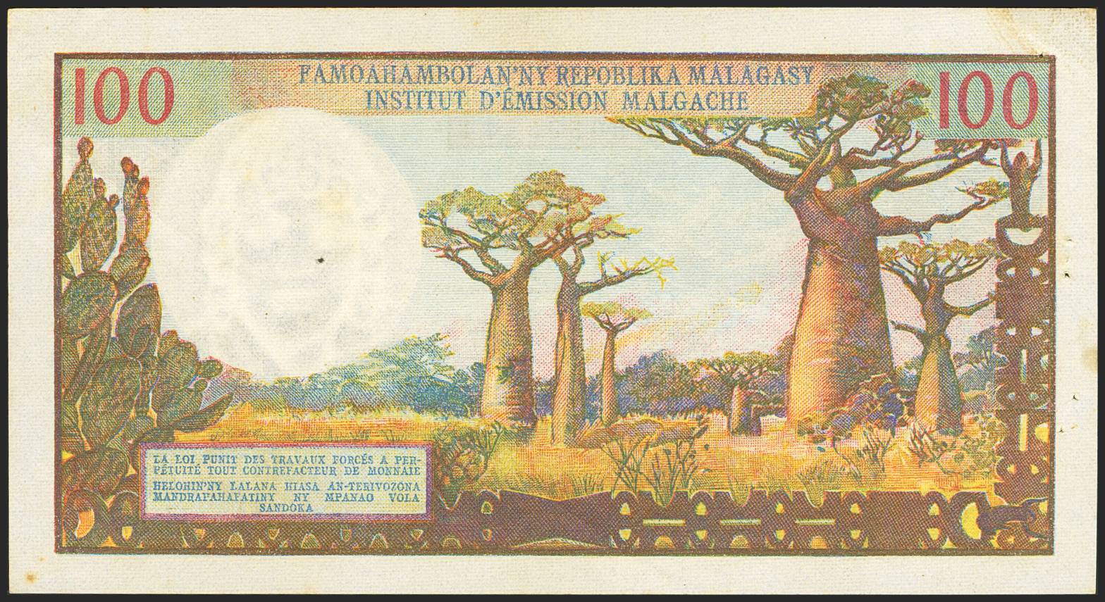 MADAGASCAR. 100 Francs. (1966ca). Institut de Emission Malgache. (Pick: 57). Stains and pinholes. Less than Uncirculated.