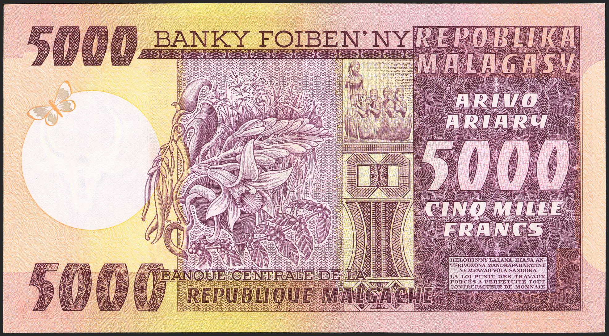 MADAGASCAR. 5000 Francs. (1974ca). Banque Centrale de la Republique Malgache. (Pick: 66). Rare especially in this quality. Uncirculated. PMG SI.