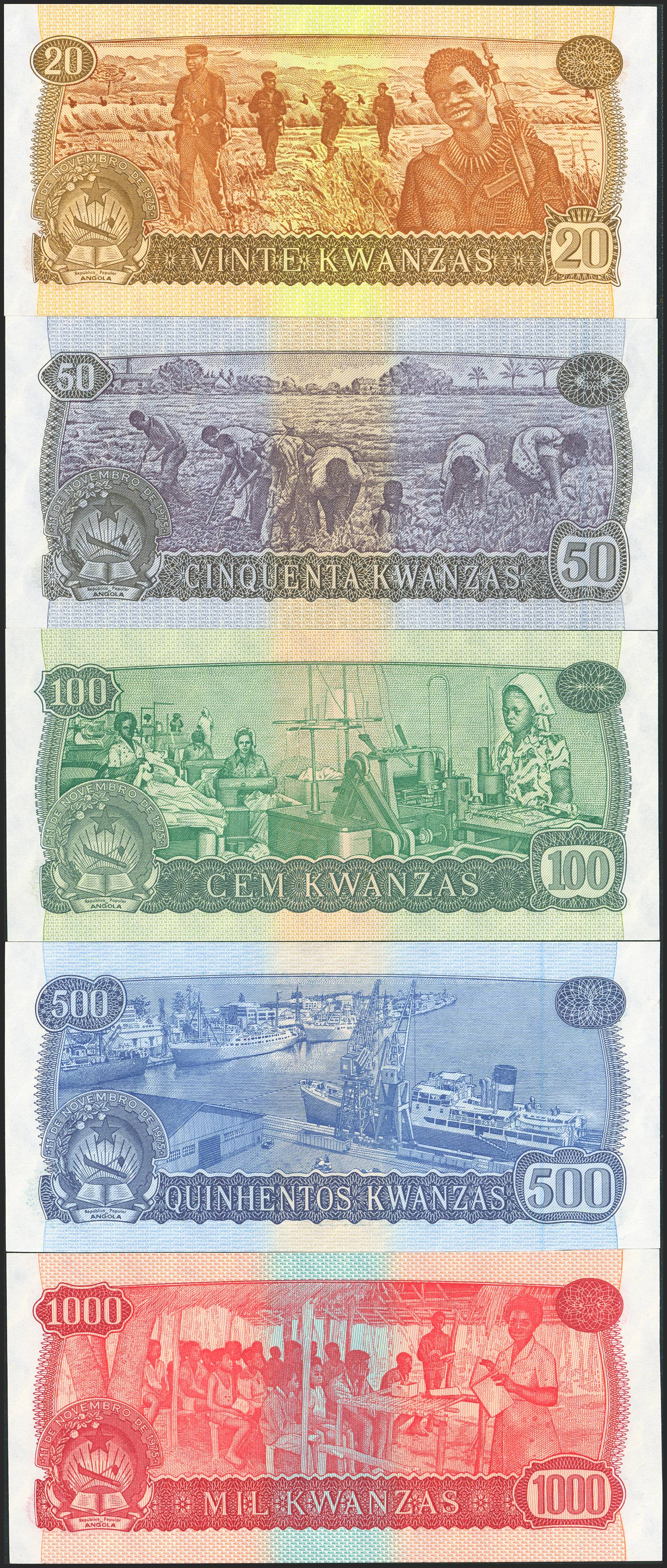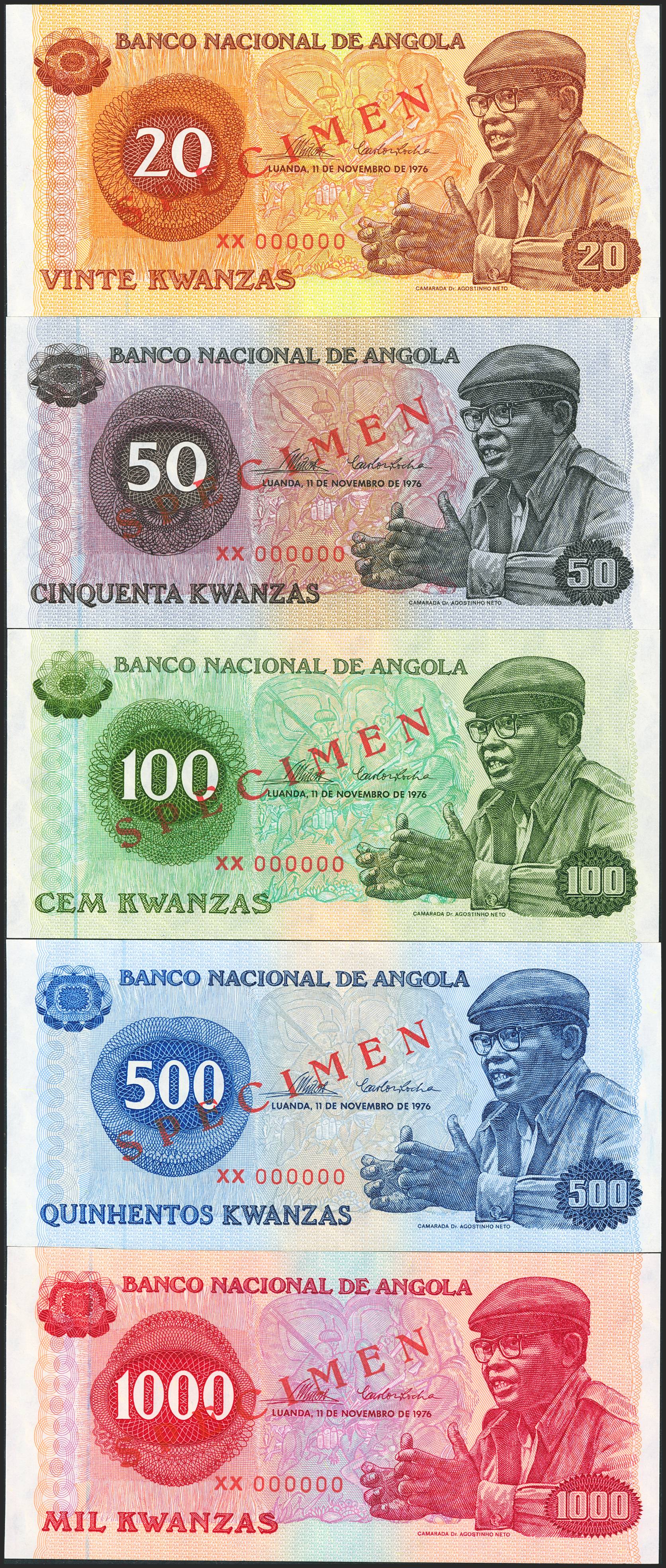 ANGOLA. Complete set of 5 notes of 20 Kwanzas, 50 Kwanzas, 100 Kwanzas, 500 Kwanzas and 1000 Kwanzas. 11 November 1976. SPECIMEN and numeration XX000000. Bank of Angola. (Pick: 109s, 110s, 111s, 112s, 113s). Uncirculated / About Uncirculated.