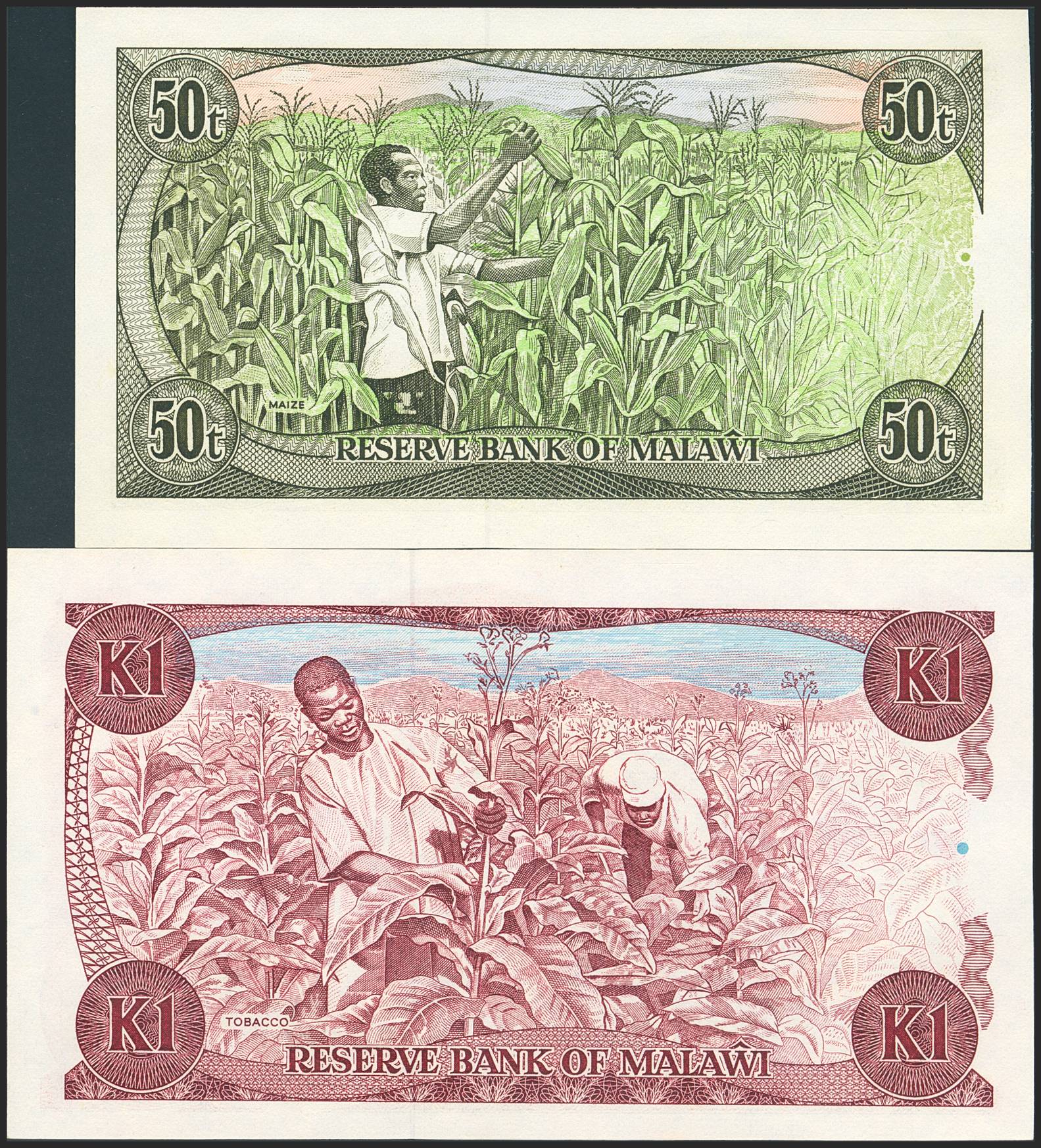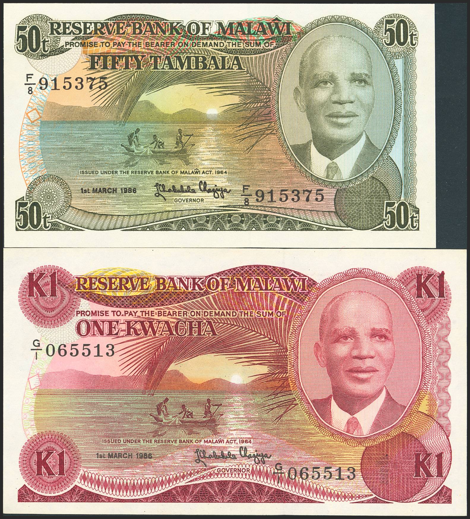 MALAWI. Lot of 2 notes of 50 Tambal and 1 Kwacha. 1 March 1986. Reserve Bank of Malawi. (Pick: 18, 19a). Uncirculated.