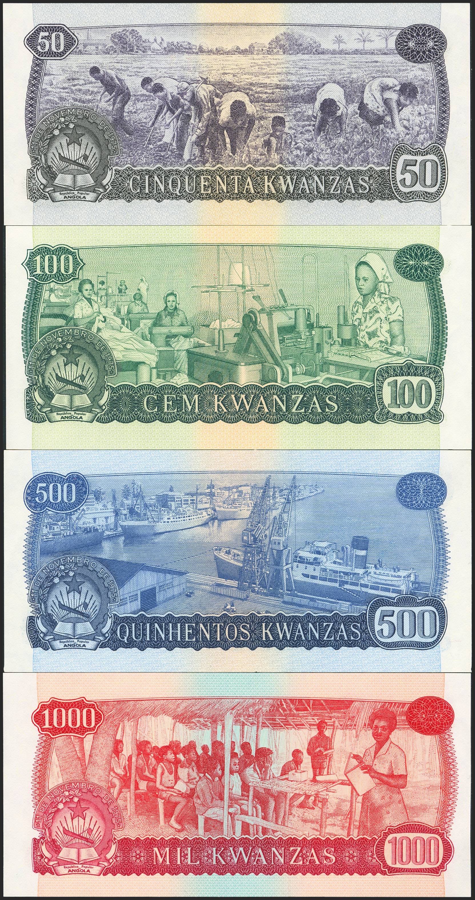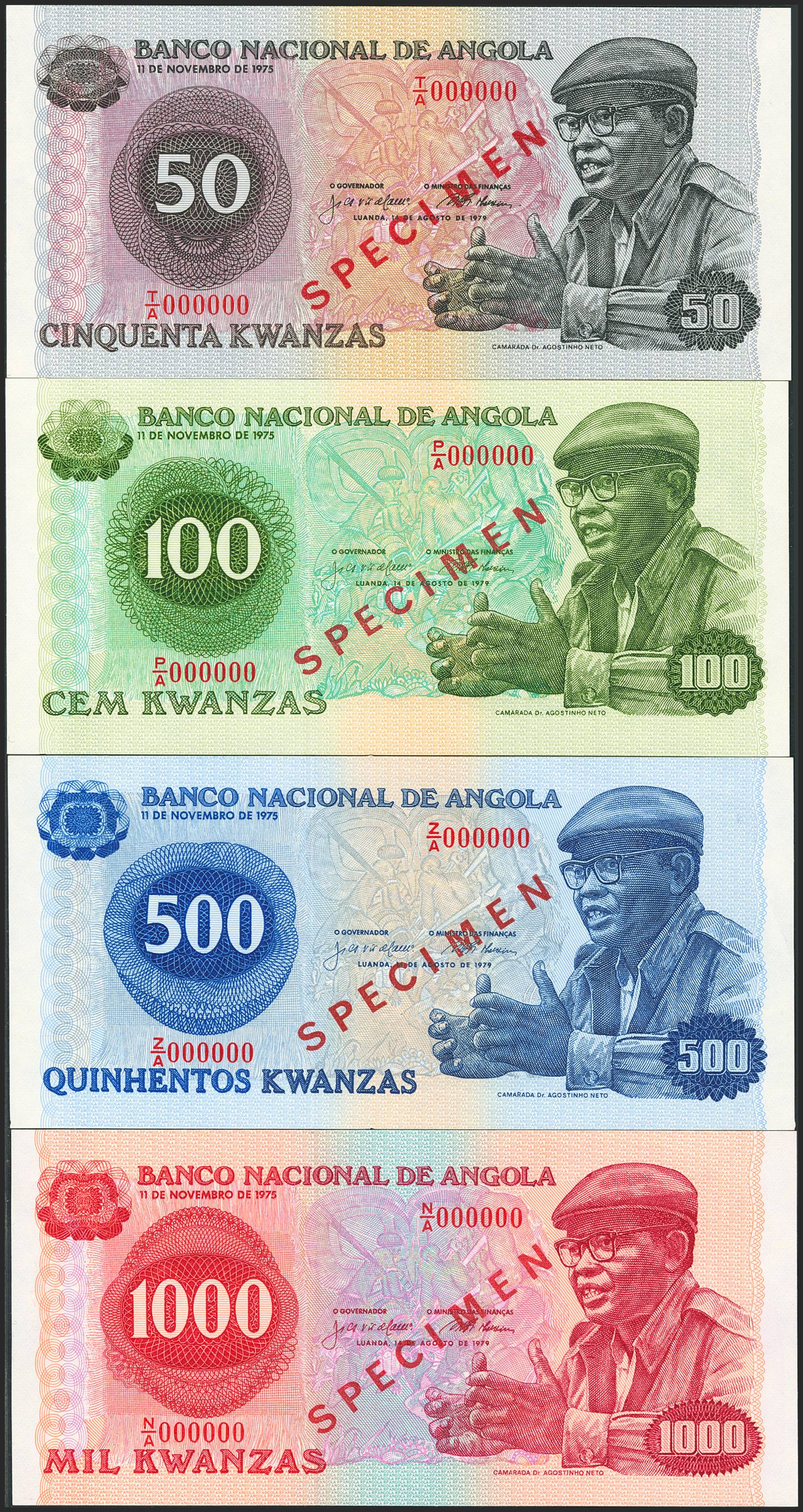 ANGOLA. Complete set of 4 notes of 50 Kwanzas, 100 Kwanzas, 500 Kwanzas and 1000 Kwanzas. 14 August 1979. Bank of Angola. SPECIMEN and numeration XX000000. (Pick: 114s, 115s, 116s, 117s). Uncirculated / Less than Uncirculated.