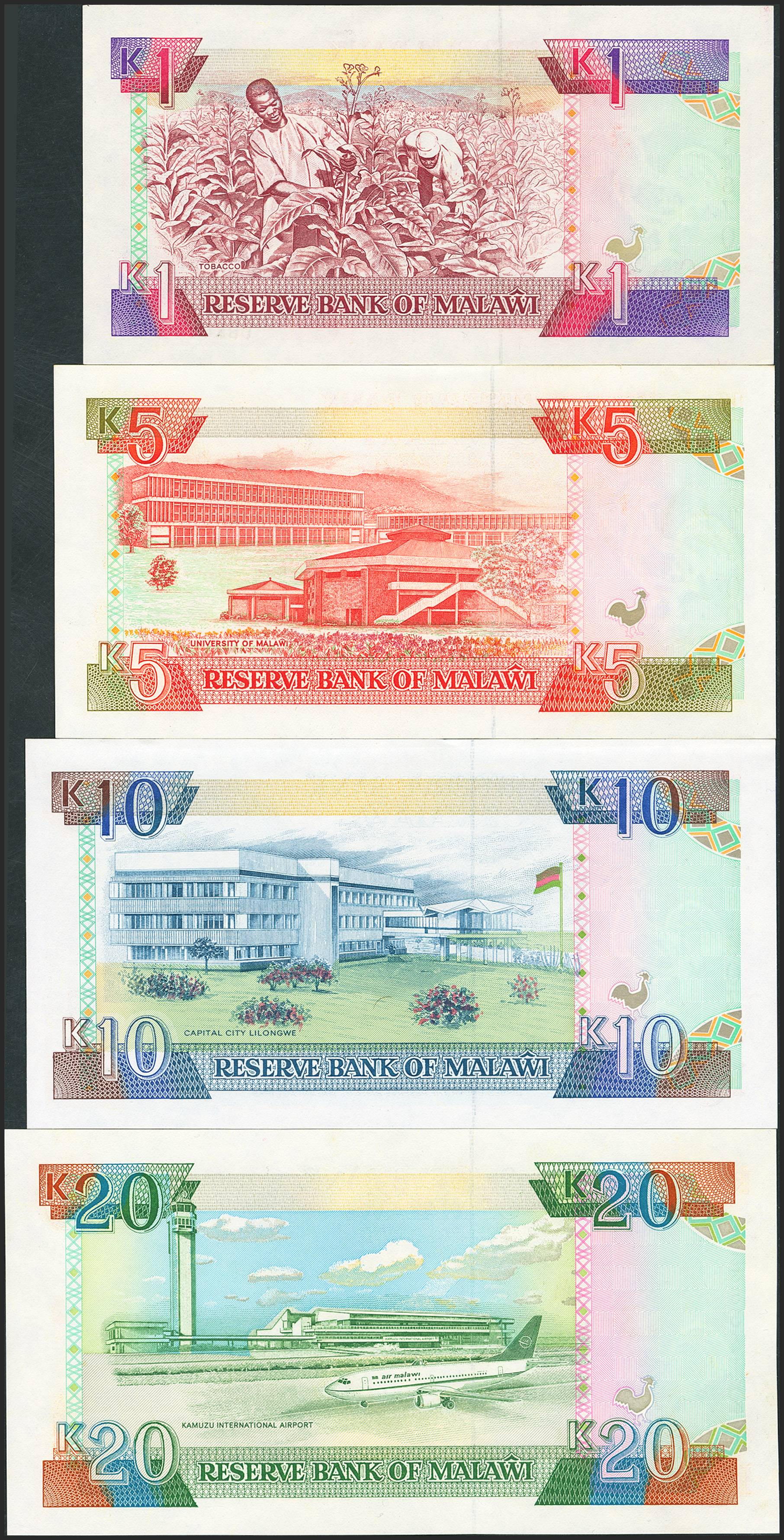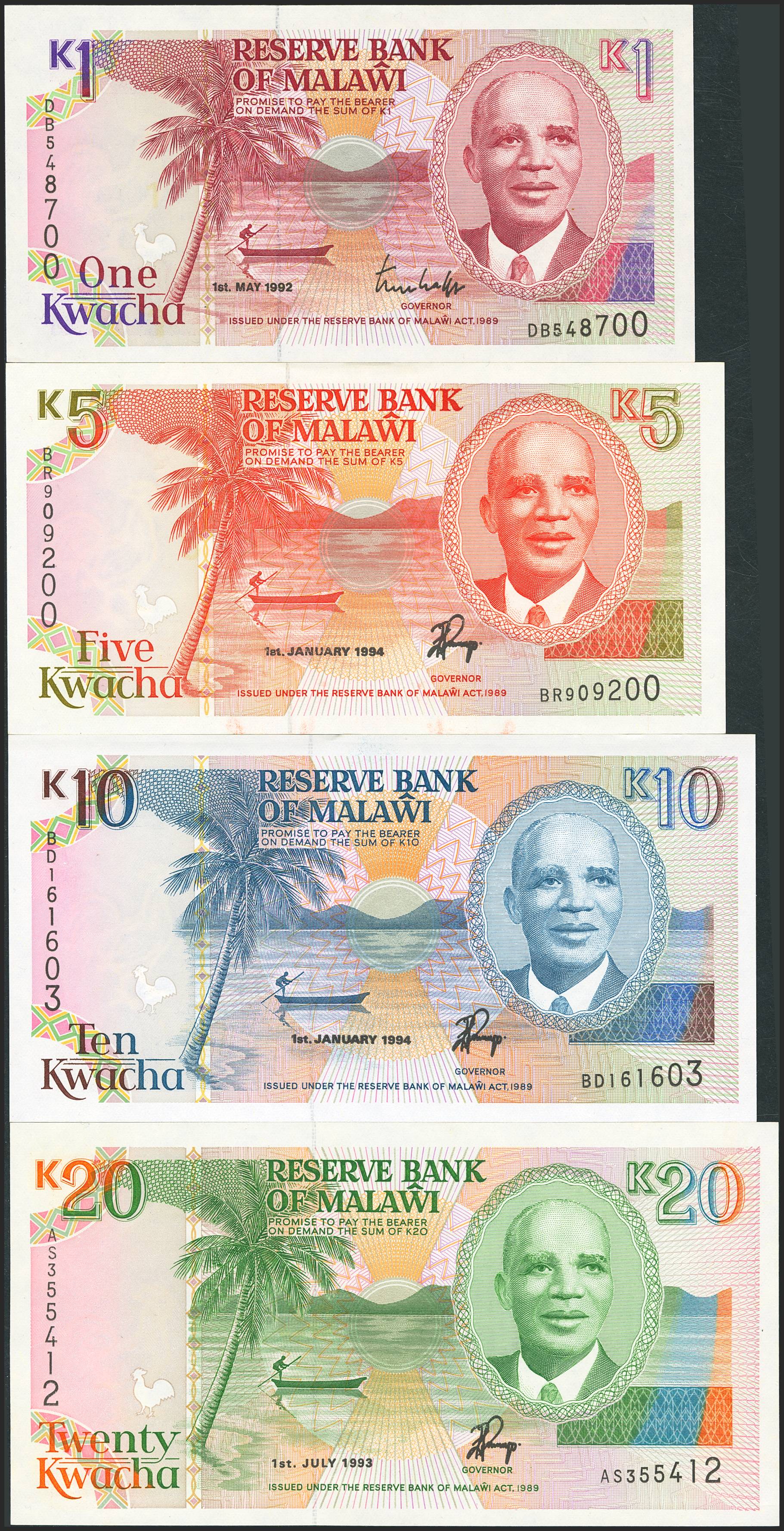 MALAWI. Lot of 4 notes of 1 Kwacha, 5 Kwacha, 10 Kwacha and 20 Kwacha. (1992ca). Reserve Bank of Malawi. (Pick: 23b, 24b, 25c, 27). Uncirculated / Less than Uncirculated.
